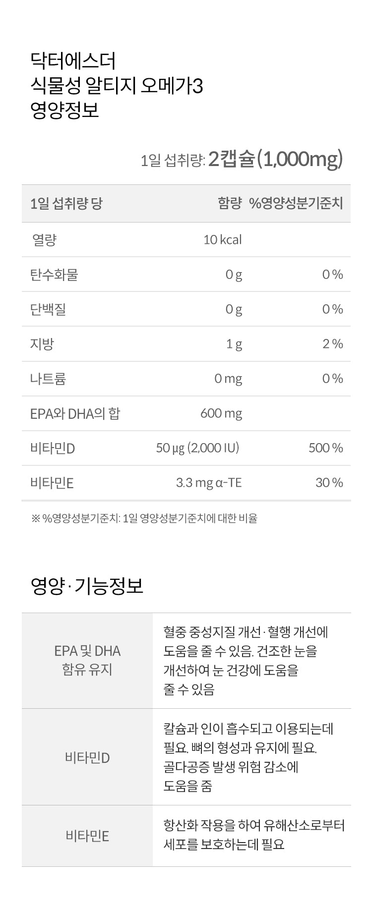 – **Daily Intake**: 600 mg of Omega 3, 2000 IU of Vitamin D, 3.3 mg-a-TE of Vitamin E