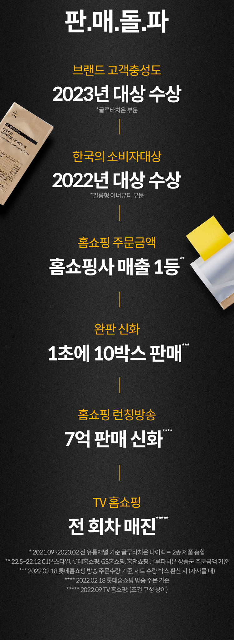 Glutathione Direct 5X won the Grand Prize in the Glutathione Division in 2023, and the Korean Consumer Target Grand Prize in the film-type inner beauty sector in 2022.