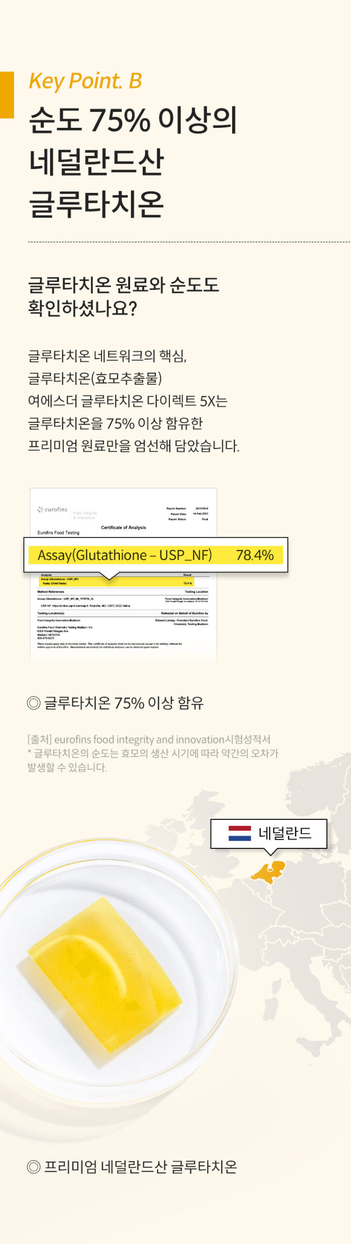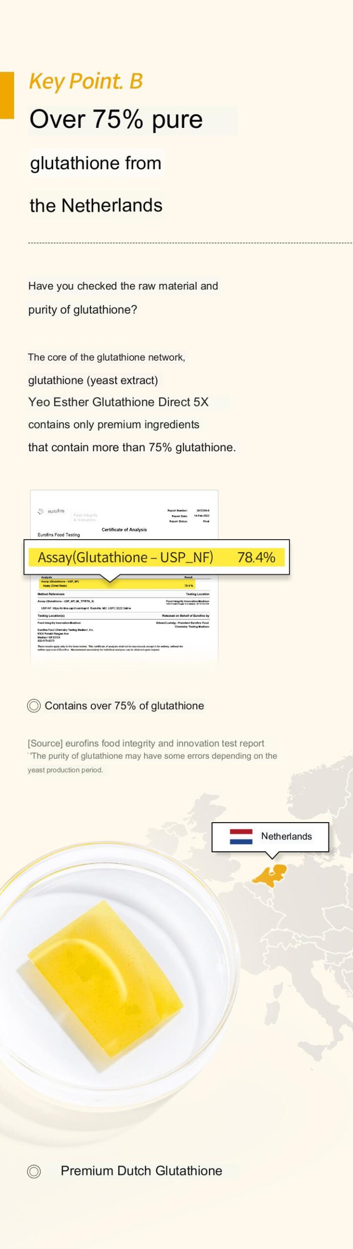Purity: The product contains over 75% pure glutathione, sourced from the Netherlands.
