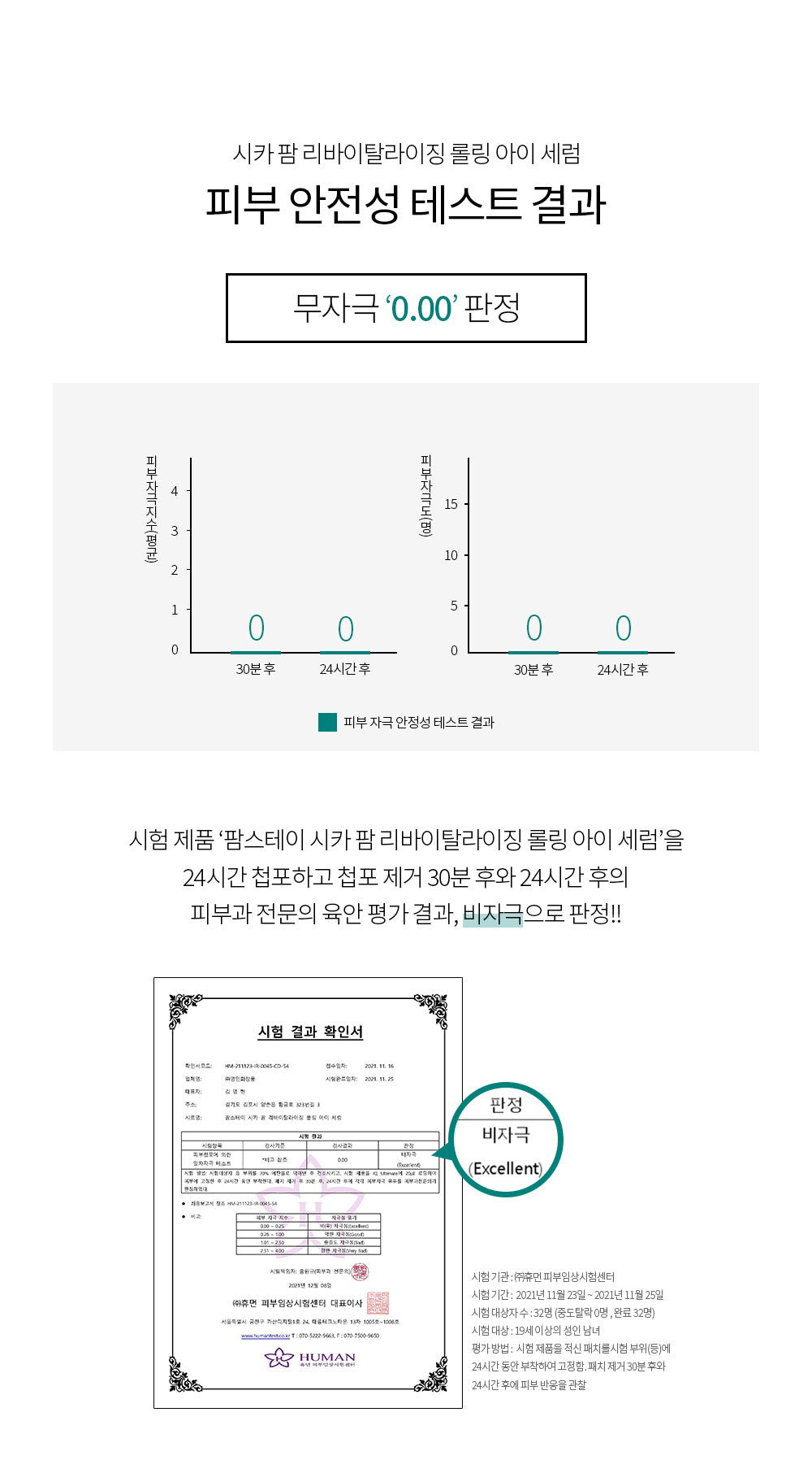 The test product ‘Farm Stay Cica Farm Revitalizing Rolling Eye Serum’ was applied for 24 hours, and the results of visual evaluation by a dermatologist 30 minutes and 24 hours after removing the patch were determined to be non-irritating!!