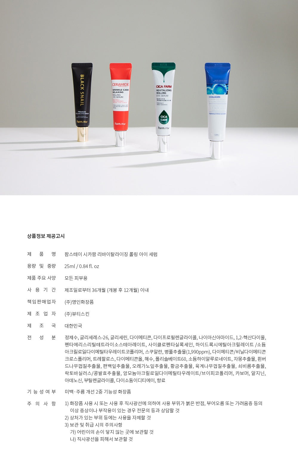 The test product ‘Farm Stay Cica Farm Revitalizing Rolling Eye Serum’ was applied for 24 hours, and the results of visual evaluation by a dermatologist 30 minutes and 24 hours after removing the patch were determined to be non-irritating!!