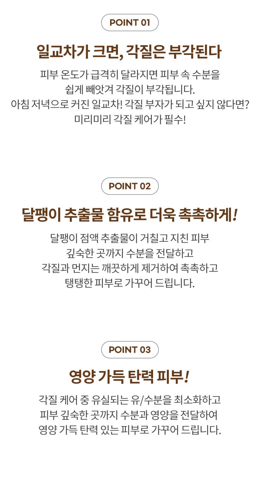 It minimizes the loss of oil/moisture during dead skin care and delivers moisture and nutrients to the deepest part of the skin to make the skin elastic and full of nutrients.