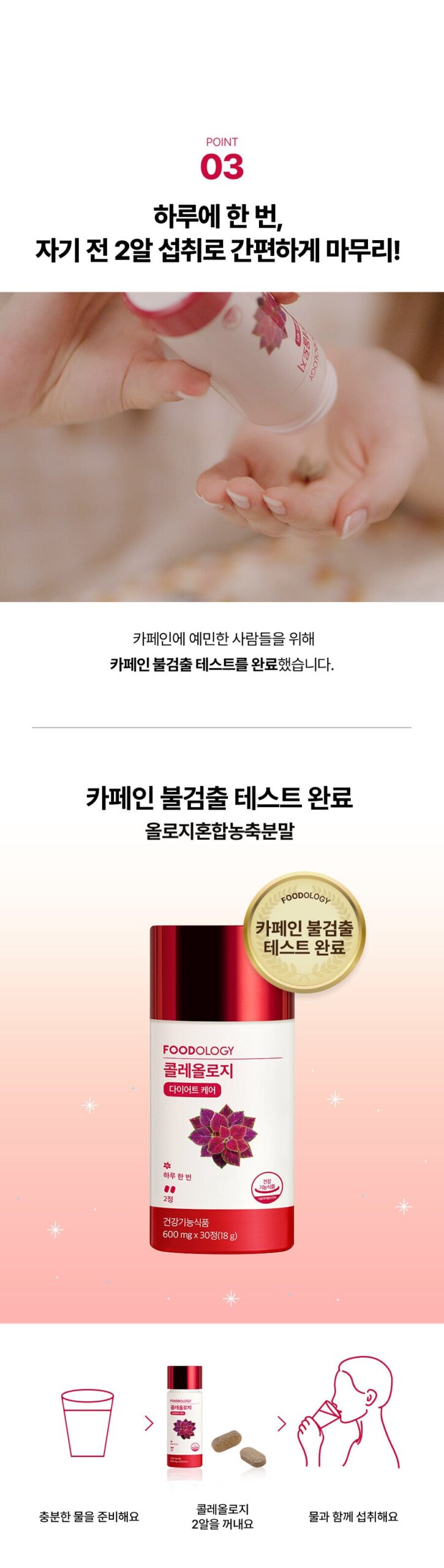 Foodology Coleology is a health functional food that has passed the evaluation of the Ministry of Food and Drug Safety, such as product safety and functionality, standards and specifications.