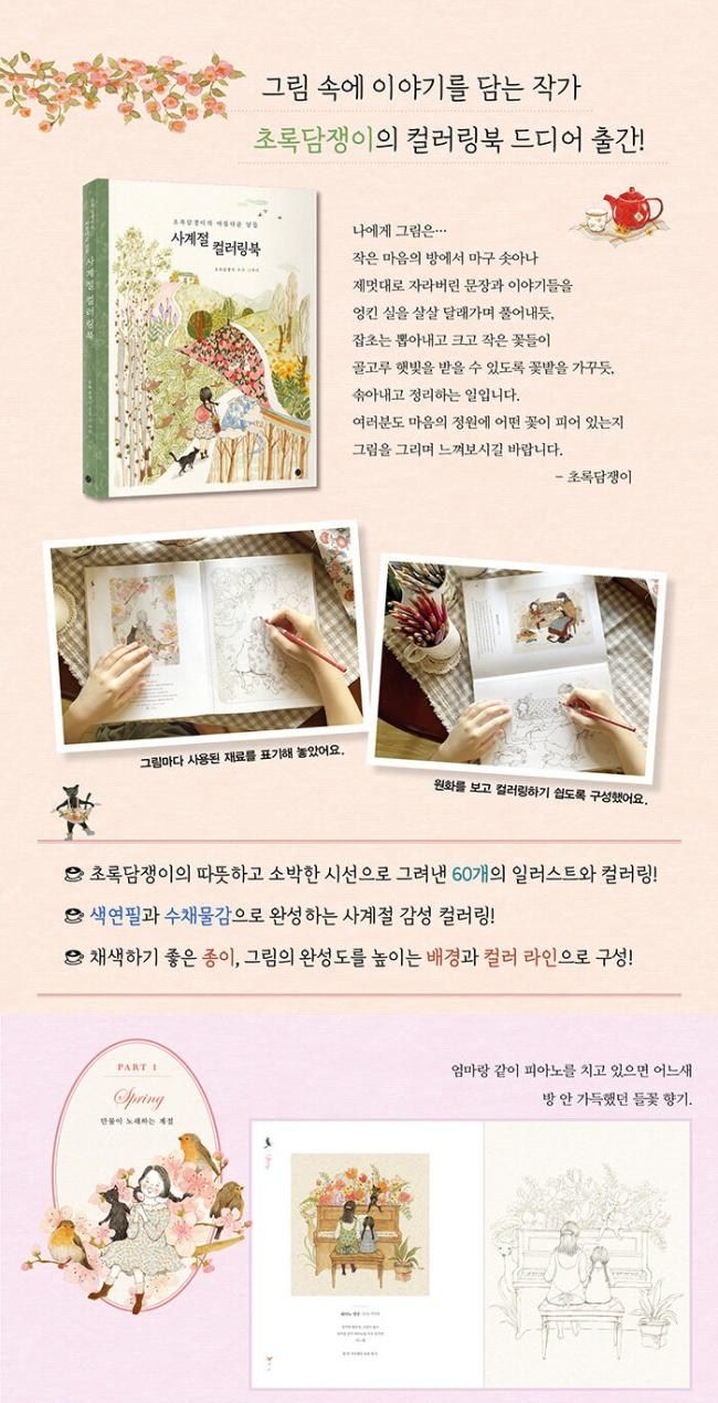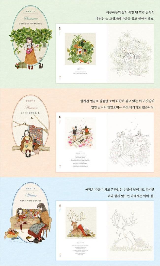 Time to share those memories with Green Ivy’s Coloring Book!The first coloring book by the artist Green Ivy, who always tells a story with simple pictures that resemble nature! Her paintings, which remind us of our beautiful days just by looking at them, always warmly caress our weary hearts. The artist, who says, “It is painting to organize the sentences and stories that spring out of the room of the heart,” contains a total of 60 illustrations and coloring pictures in this coloring book.This coloring book is based on the beautiful scenery and stories of the four seasons. It summoned beautiful memories that everyone should have at least one of them and loaded them with lovely characters in a variety of ways. The painting, which seems to have captured a scene from childhood, evokes vague memories that have been forgotten. The appearance of a girl having fun with her animal friends, such as cats, dogs, and deer, makes you smile softly just looking at her. You can enjoy the pleasure of painting with your own hands, the artist’s illustrations depicting the beauty of nature in the four seasons with a warm gaze. The author’s lyrical words accompanying each painting double the pleasure of appreciating the work.
