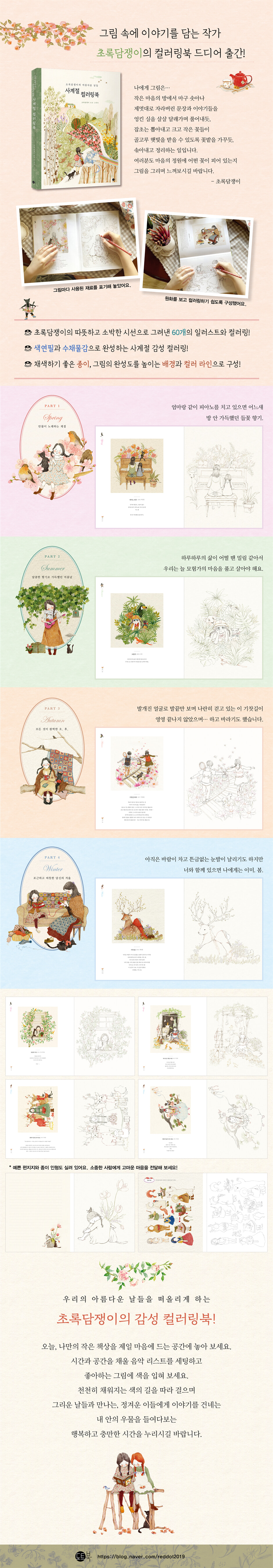 Time to share those memories with Green Ivy’s Coloring Book!The first coloring book by the artist Green Ivy, who always tells a story with simple pictures that resemble nature! Her paintings, which remind us of our beautiful days just by looking at them, always warmly caress our weary hearts. The artist, who says, “It is painting to organize the sentences and stories that spring out of the room of the heart,” contains a total of 60 illustrations and coloring pictures in this coloring book.This coloring book is based on the beautiful scenery and stories of the four seasons. It summoned beautiful memories that everyone should have at least one of them and loaded them with lovely characters in a variety of ways. The painting, which seems to have captured a scene from childhood, evokes vague memories that have been forgotten. The appearance of a girl having fun with her animal friends, such as cats, dogs, and deer, makes you smile softly just looking at her. You can enjoy the pleasure of painting with your own hands, the artist’s illustrations depicting the beauty of nature in the four seasons with a warm gaze. The author’s lyrical words accompanying each painting double the pleasure of appreciating the work.Various coloring pages composed of free aspect ratios were completed with a ‘guide color’ line so that anyone can implement the original image. In addition, an off-white background with the feeling of cotton was applied to the background to further bring out the emotion of ‘nostalgia’ that the artist wanted to convey. You can easily paint with colored pencils or watercolors, and you will be able to complete your own artwork with high perfection. In the appendix, there are stationery where you can write your own story along with coloring, and paper dolls that you can keep as props. A beautiful coloring book that can be colored according to the artist’s work or with your own colors! Now that the time at home has increased, let’s enjoy a comfortable and warm healing time with Green Ivy’s Coloring Book.