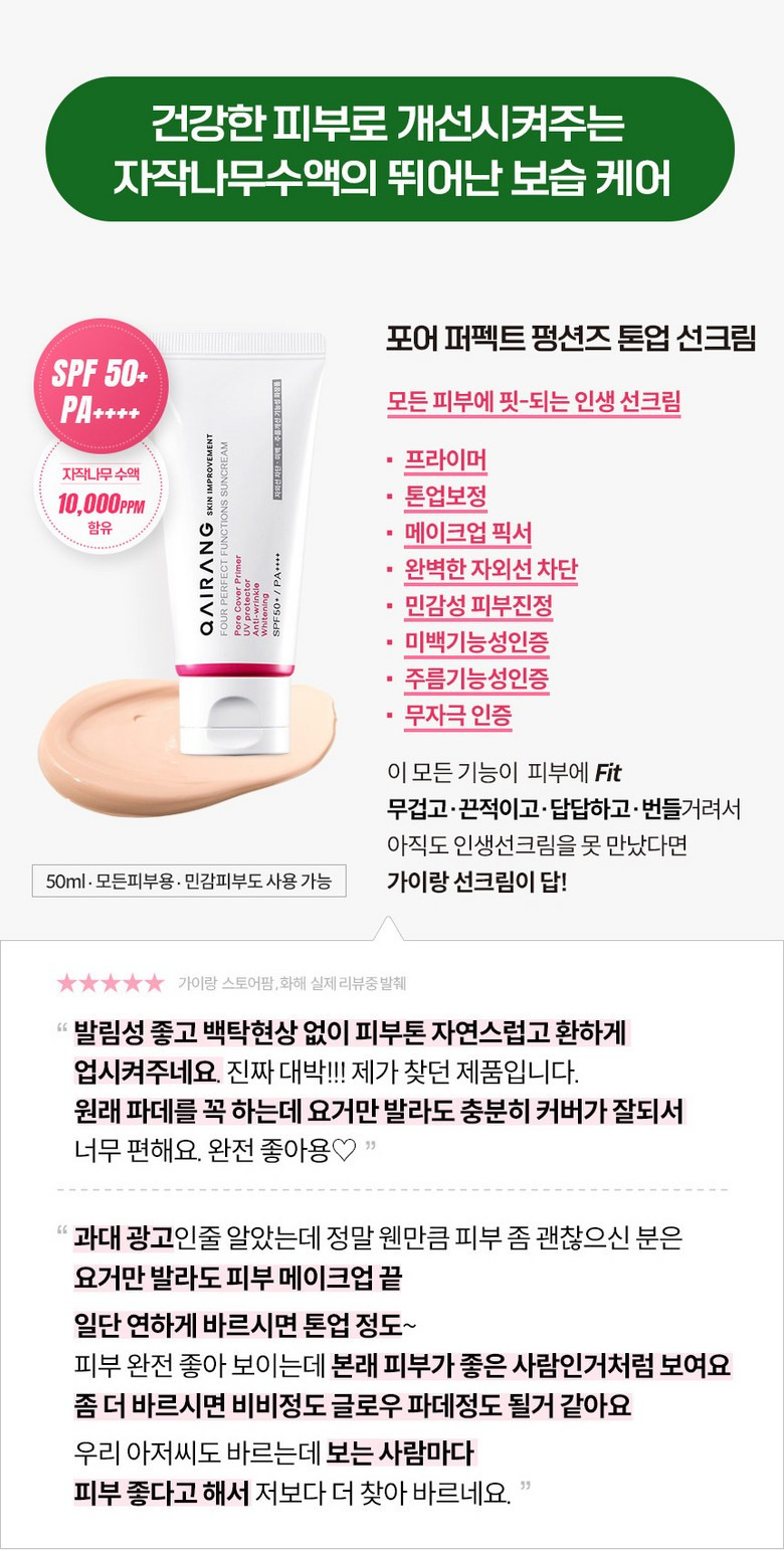 - “Perfect Foundation Substitute!” – “This sunscreen corrects perfectly with just one application. It provides a natural tone-up with nearly no white cast and has little to no skin irritation. Absolutely satisfied!”