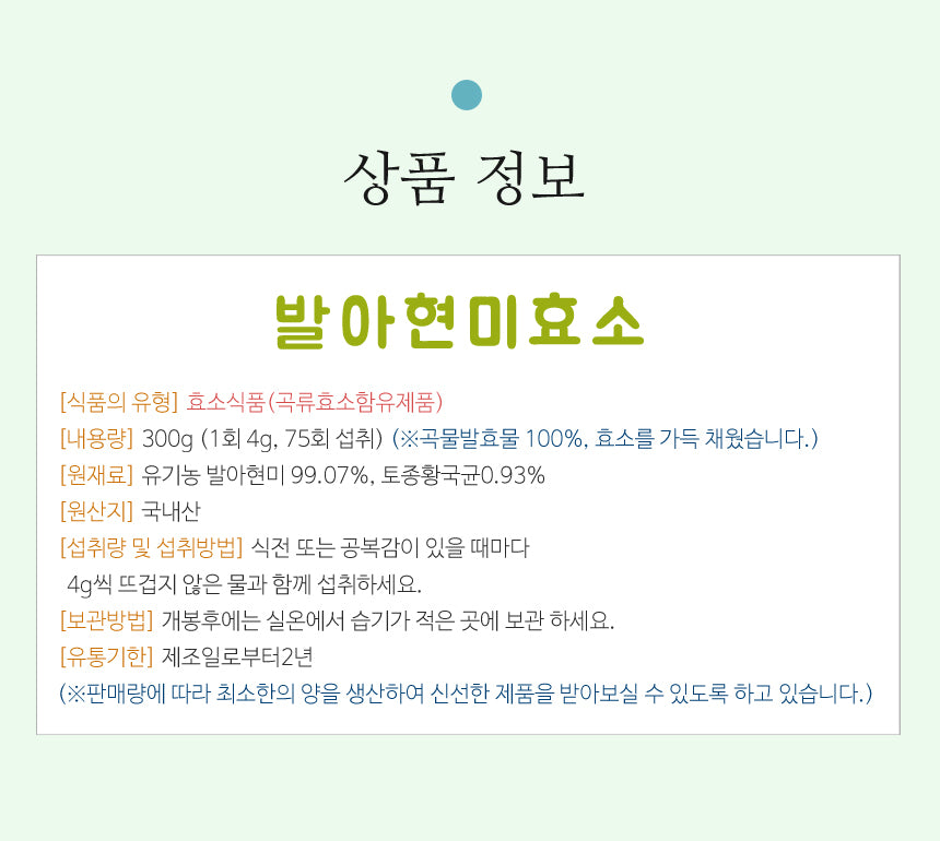 It is fermented for a long time with a natural fermentation method using Hwanggukgyun (microorganism, Aspergillus oryzae N041), which is rich in beneficial bacteria and active enzymes, and numerous nutrients of germinated brown rice are easily digested and decomposed to help improve health, improve constitution, and supply nutrients.