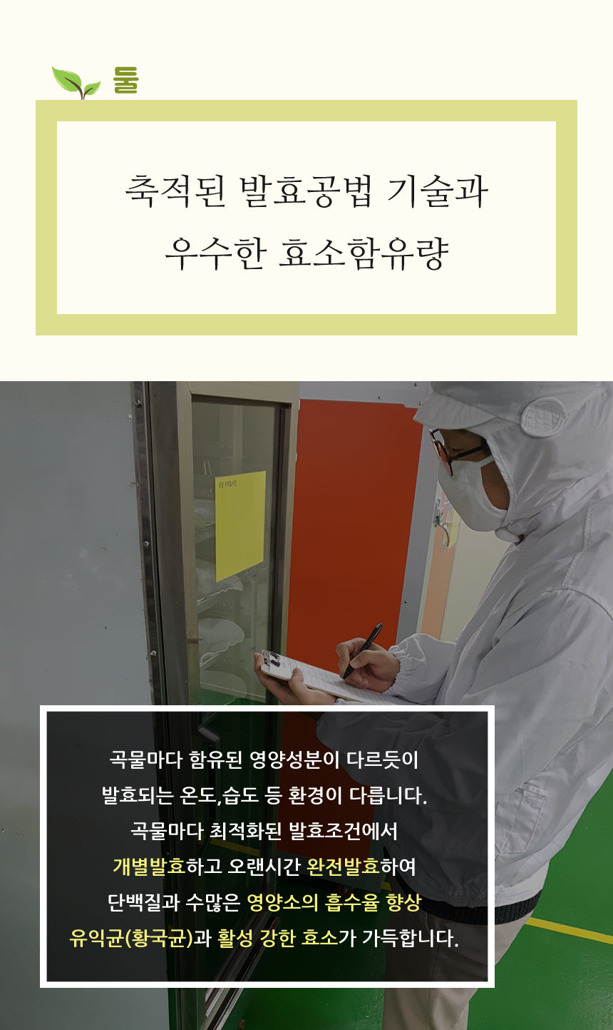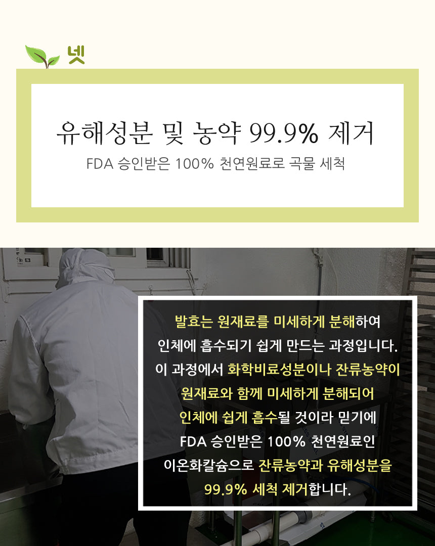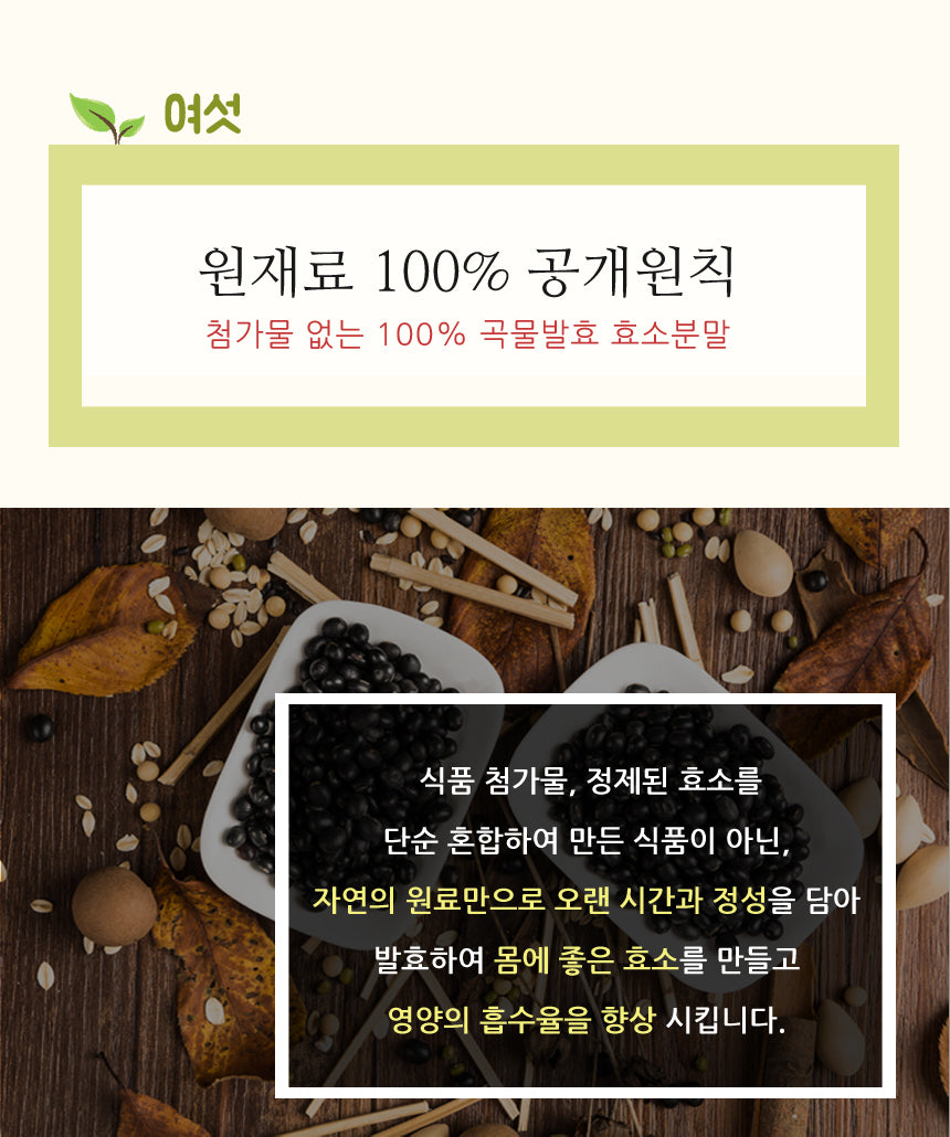 Just as the nutrients contained in each grain are different, the fermentation temperature and humidity are different. Each grain is individually fermented under optimized fermentation conditions and fully fermented for a long time to improve the absorption of protein and numerous nutrients. It is full of beneficial bacteria (Hwanggukgyun) and active enzymes.