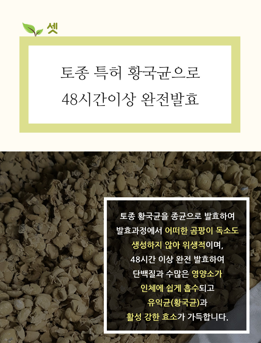 It is hygienic as it does not produce any mycotoxin in the fermentation process by fermenting native Hwanggukgyun as a spawn, and fully fermented for more than 48 hours, protein and numerous nutrients are easily absorbed by the human body, and is full of beneficial bacteria (Hwanggukgyun) and active enzymes.