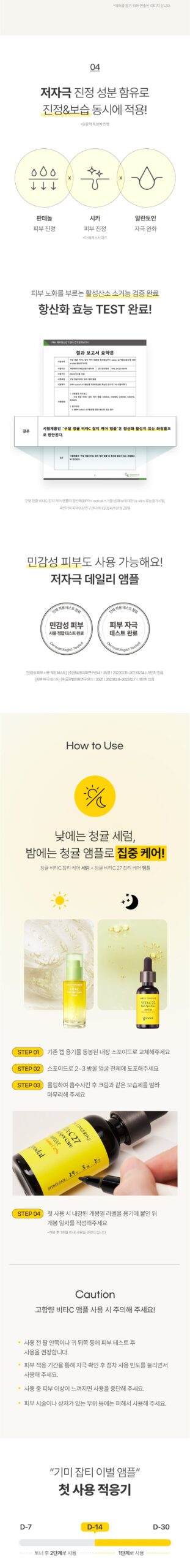 High-concentration vitamin C ampoules require careful usage. It is recommended to perform a patch test on the inner arm or behind the ear before use. Gradually increase usage frequency as your skin adapts. Discontinue use if any skin irritation occurs. Avoid applying on areas with treatments or open wounds.