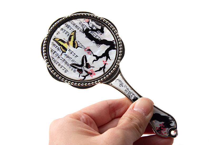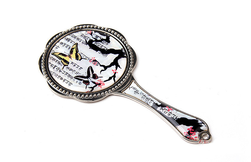 * Hand Mirror With Beautiful Mother Of Pearl Handle, Mother Of Pearl Handle Mirror – Plum Butterfly / Made in Korea
