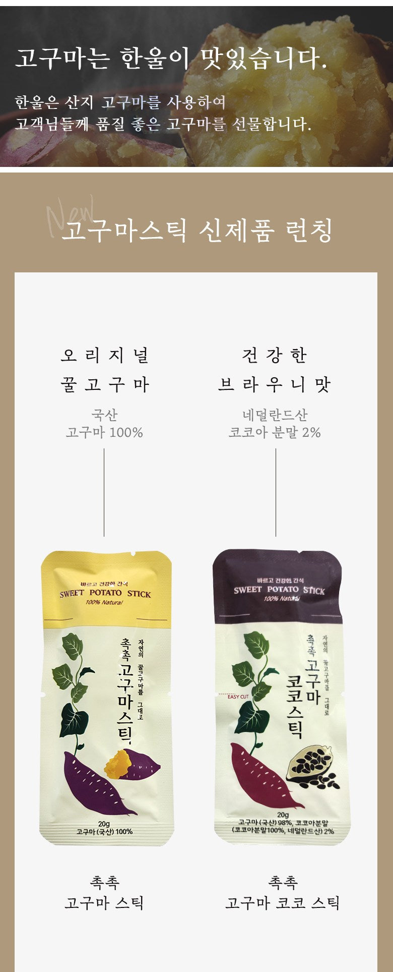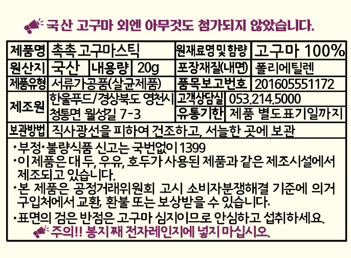 Hanul embraces the essence of nature in every product. We ensure that nothing but 100% domestic sweet potatoes are used in our Moist Sweet Potato Mastic Stick. Our commitment to quality and natural ingredients stands as the cornerstone of our brand.