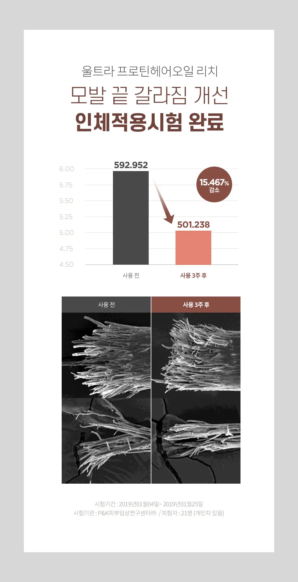 A human application test has shown a significant improvement in split ends, with a 15.467% decrease after just three weeks of use. This test, conducted by P&K Skin Clinical Research Center Co., Ltd., underscores the effectiveness of Ultra Protein Hair Oil Rich in transforming damaged hair.