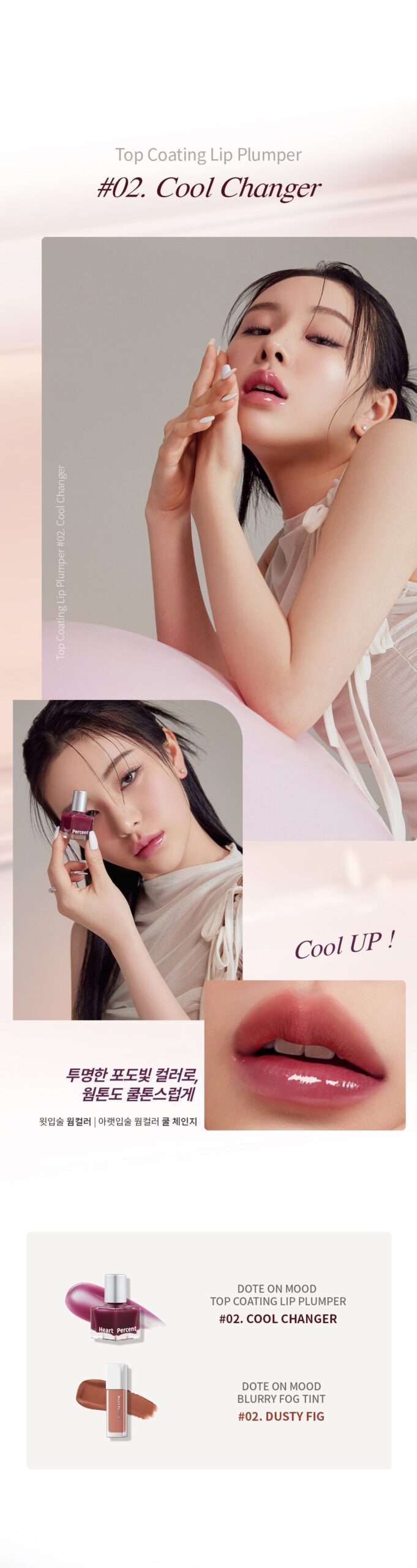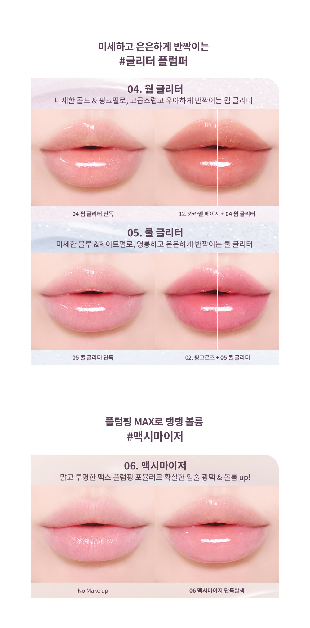 - Normal Version (01~05): Contains menthol, ideal for those seeking a gentle plumping effect with a subtle tone change and added glitter.