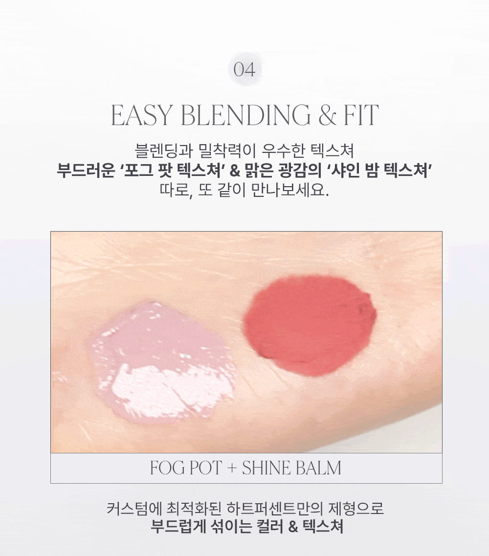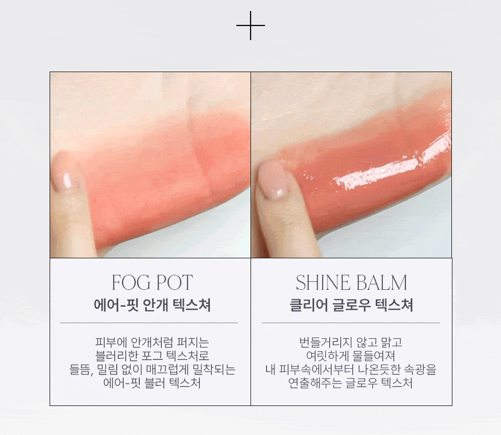 The soft fog pot texture delivers a delicate, blurred effect, while the shine balm texture creates a radiant, glowing finish. Achieve seamless blending and a natural fit for an effortless makeup look.