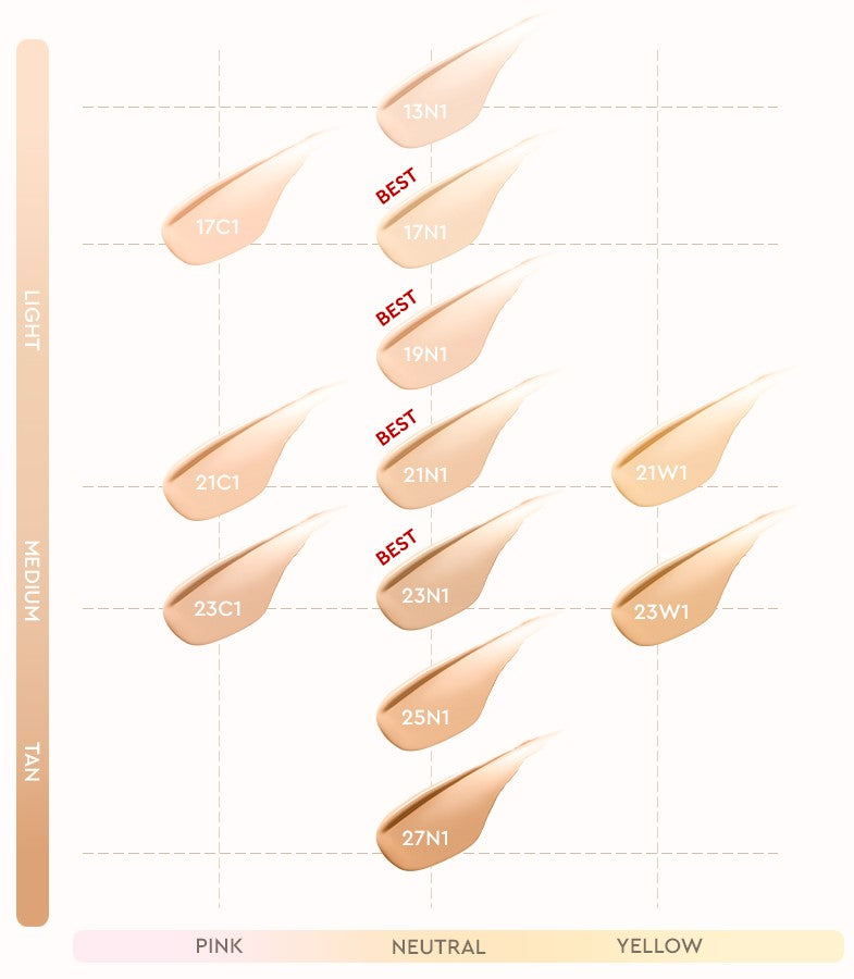 - TRUE MATCH SHADE : 12 Shades is available on warm, cool and neutral undertones. Each shade is based on asian skin fit data. Because of coating pigment, the layers seamlessly offer your skin fit your own tones.