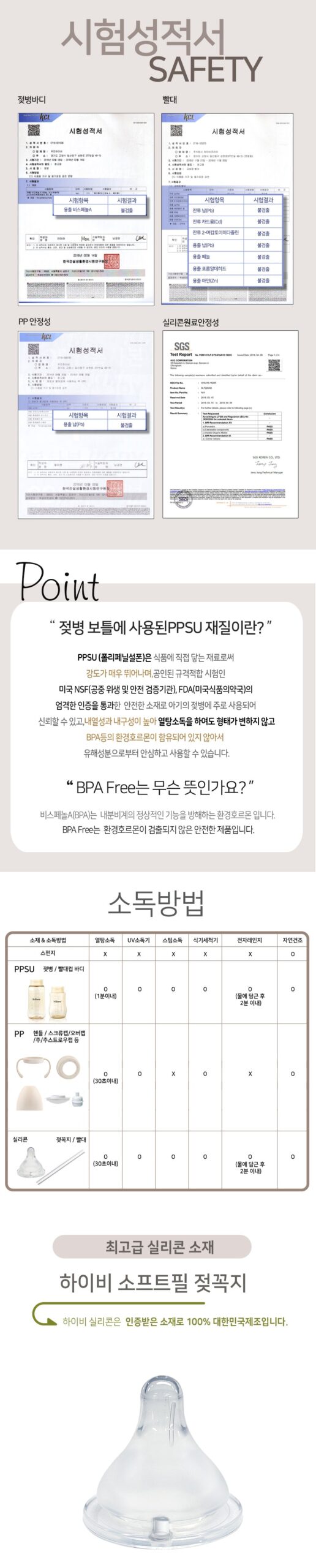 PPSU (Polyphenylsulfone) is a material that comes in direct contact with food and has excellent strength, and is a safe material that has passed strict certifications from the US NSF (Public Health and Safety Verification Agency) and FDA (US Food and Drug Administration), which are certified conformance tests. As it is mainly used for babies’ feeding bottles, it is reliable, has high heat resistance and durability, does not change its shape even after sterilization in boiling water, and does not contain environmental hormones such as BPA, so it can be used safely from harmful substances.