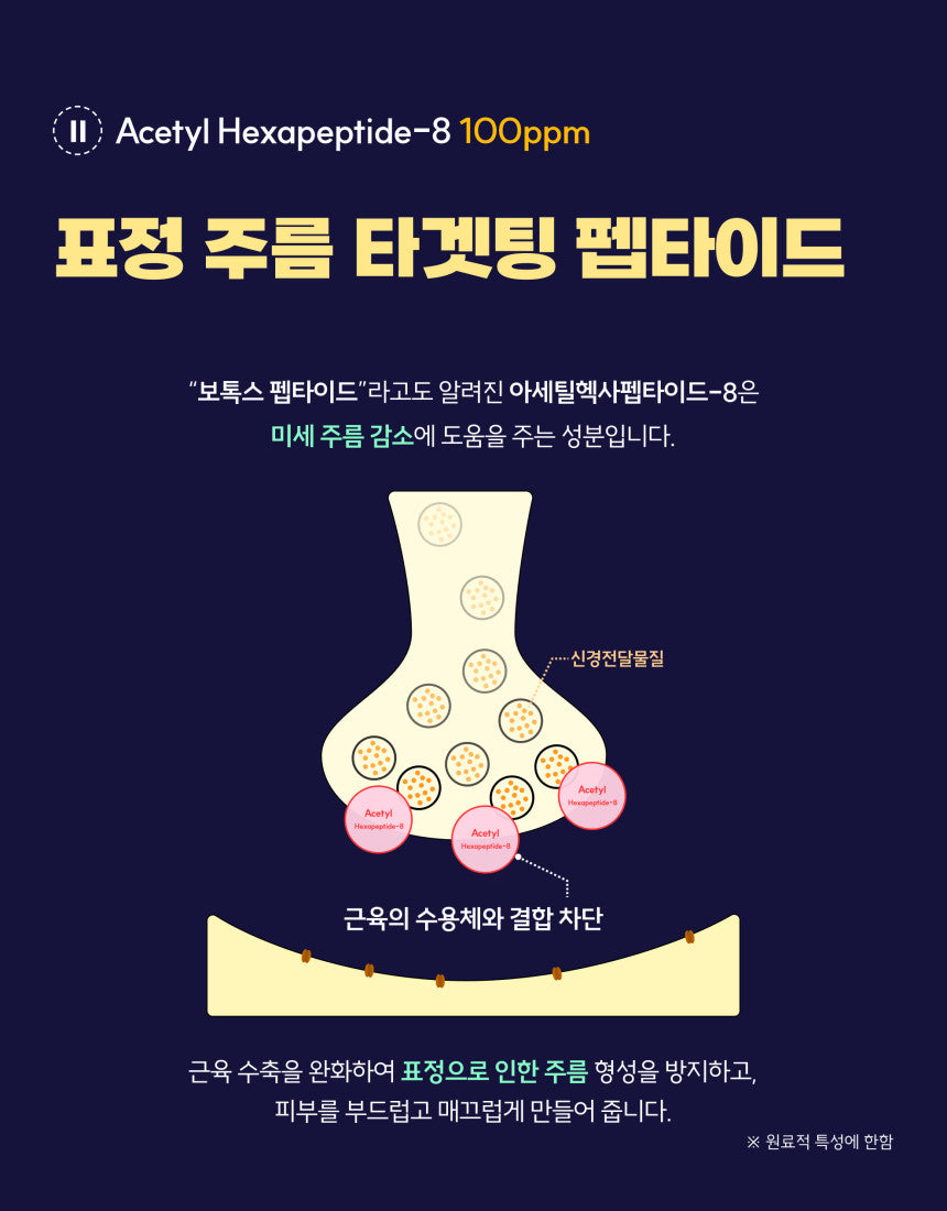 - Known as the “Botox peptide,” it relaxes facial muscles to minimize expression lines.