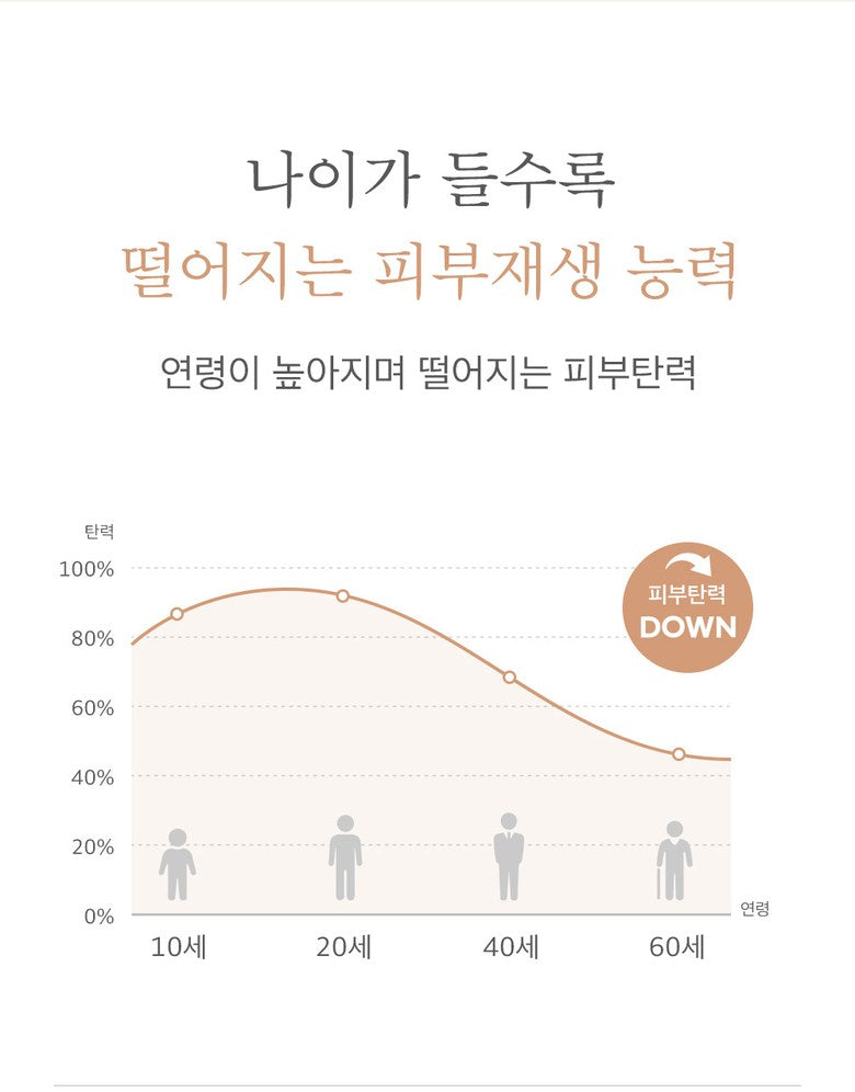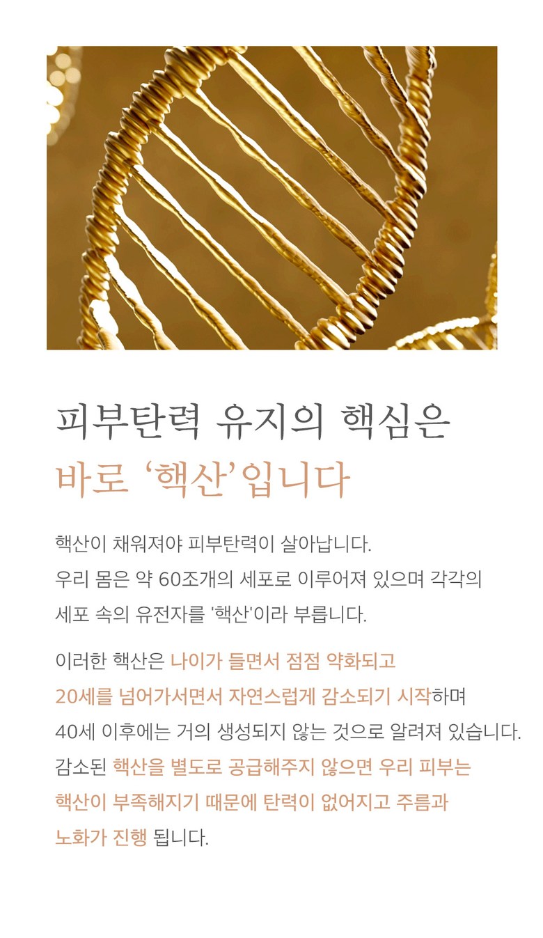 It is known that these nucleic acids become weaker with age, begin to naturally decrease after the age of 20, and are rarely produced after the age of 40. If the reduced nucleic acid is not supplied separately, our skin will lack nucleic acid, so it loses elasticity and wrinkles and aging progress.