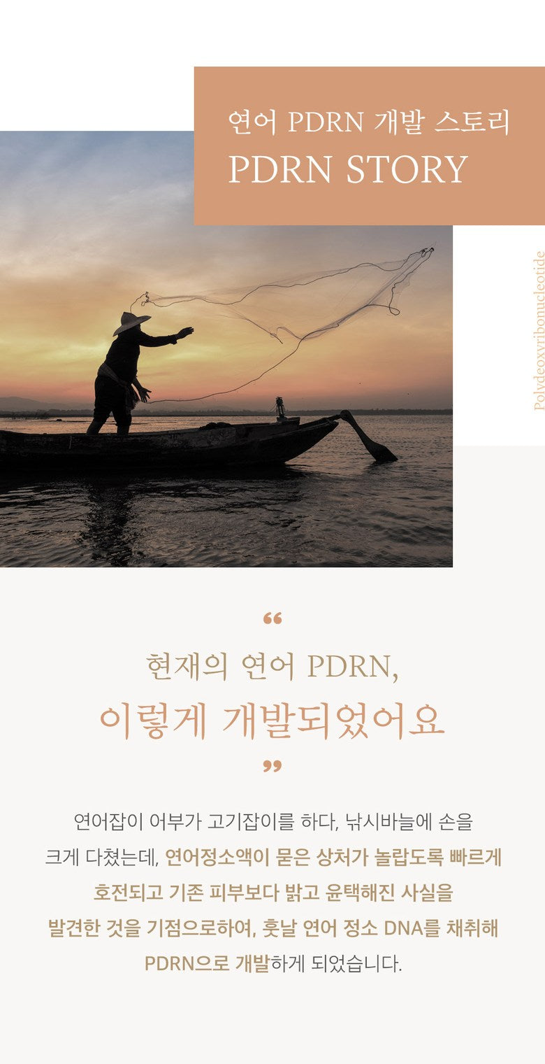A fisherman caught salmon while fishing, and his hand was severely injured by a fishing hook. It was found that the wound with salmon testicular fluid improved surprisingly quickly and became brighter, more shiny, and glossy than the existing skin. Later, by researching salmon, salmon DNA was collected and developed as PDRN.