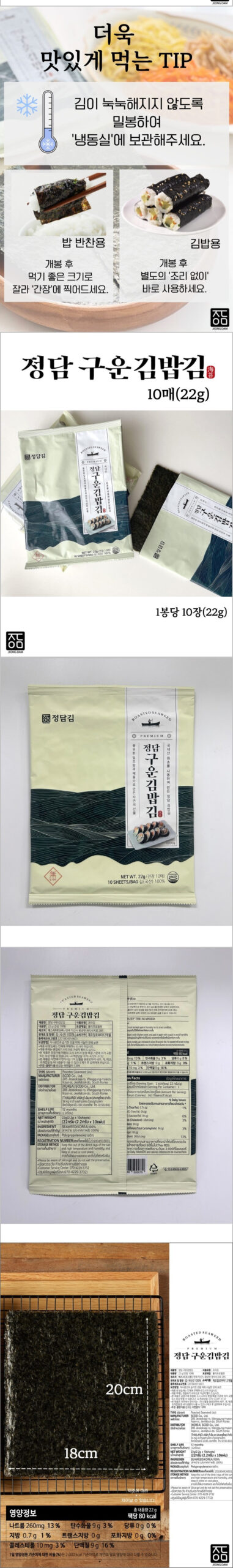 To maintain the optimal texture and freshness of Jeongdam Grilled Gimbap Kim, please store the product in your freezer. Ensure the package is sealed properly to prevent the seaweed from becoming soggy.