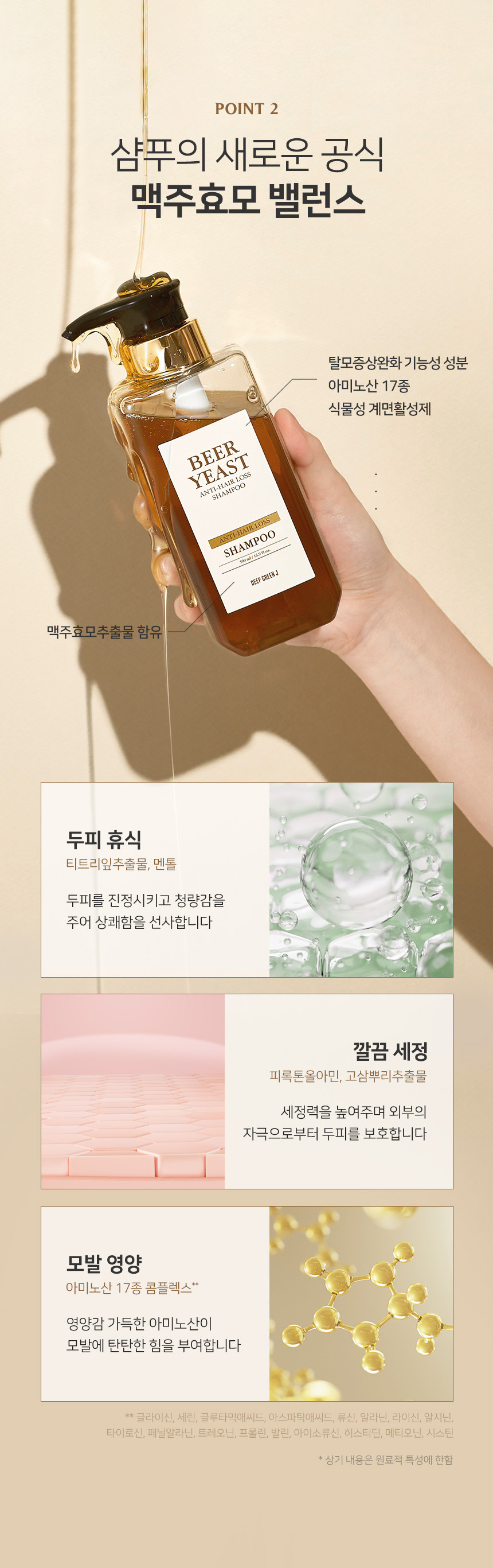 Our shampoo is enriched with 17 types of amino acids and a vegetable surfactant, making it a powerful formula for hair loss relief. Key ingredients include: