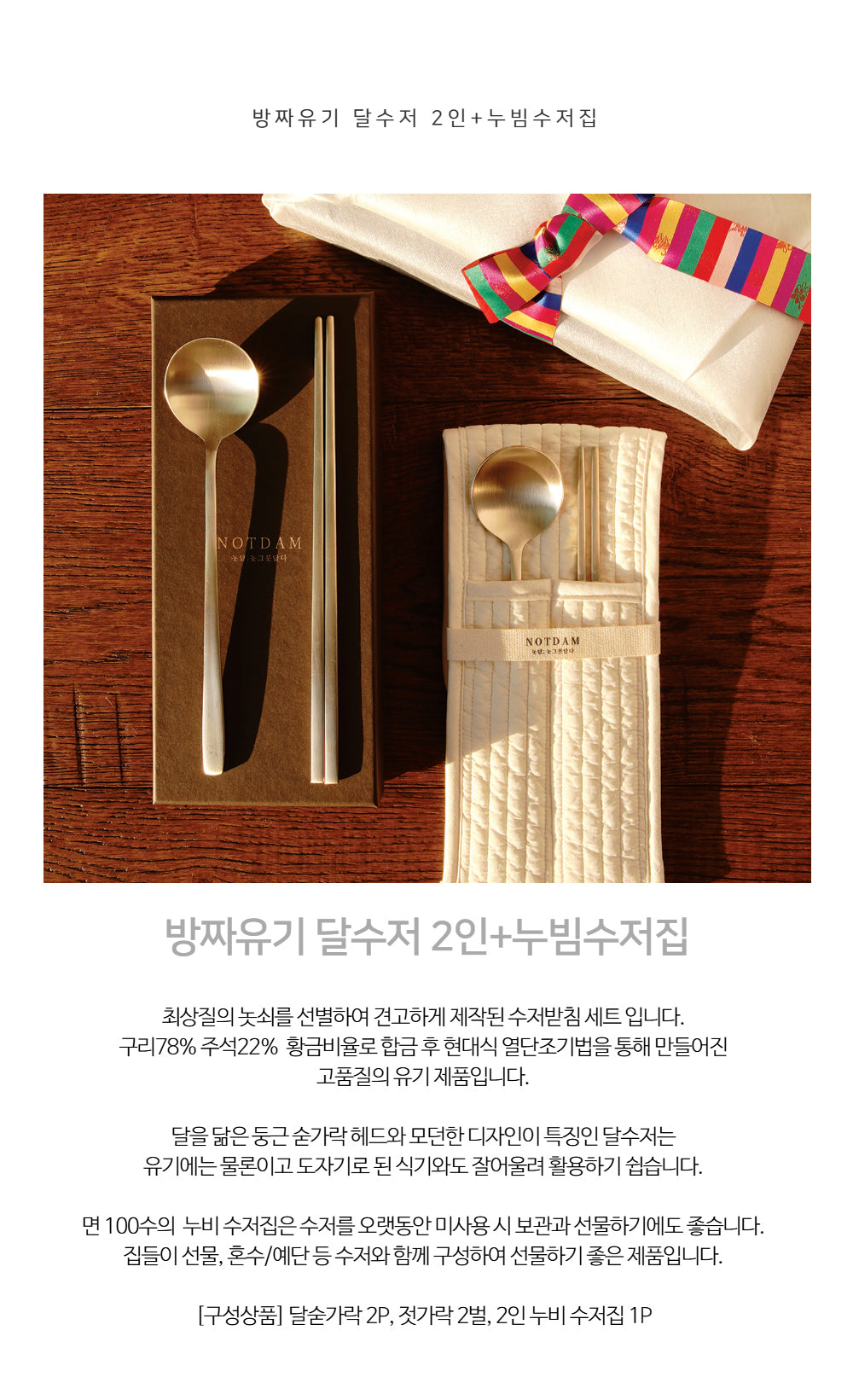 قُلت عن طقم الملاعق والعيدان Bangjja Yugi، إن مستوى الفخامة لم يكن له مثيل. الصنع اليدوي الاستثنائي جاء من تراث الحرفيين أصحاب المهارات العالية في البناء والدقة مما خلق توهجاً يُشع بالفخر على كل مائدة تجمع الأحبة والأصدقاء. تميزت القطع بقوتها الملحوظة ومقاومتها للجراثيم بفضل مواد النحاس والقصدير الذي يحتوي عليها بنسبة فائقة التوازن . أما حاملة الملعقتين المحاطة بالنسيج القطني المدبوغ بإبداع فلقد أضافت شعورًا بالمسة المحلية الأنيقة جعلتك تشعر بأنك جزءٌ حي من هذه الثقافات الرائعة مثل ما يعبّر المكان.