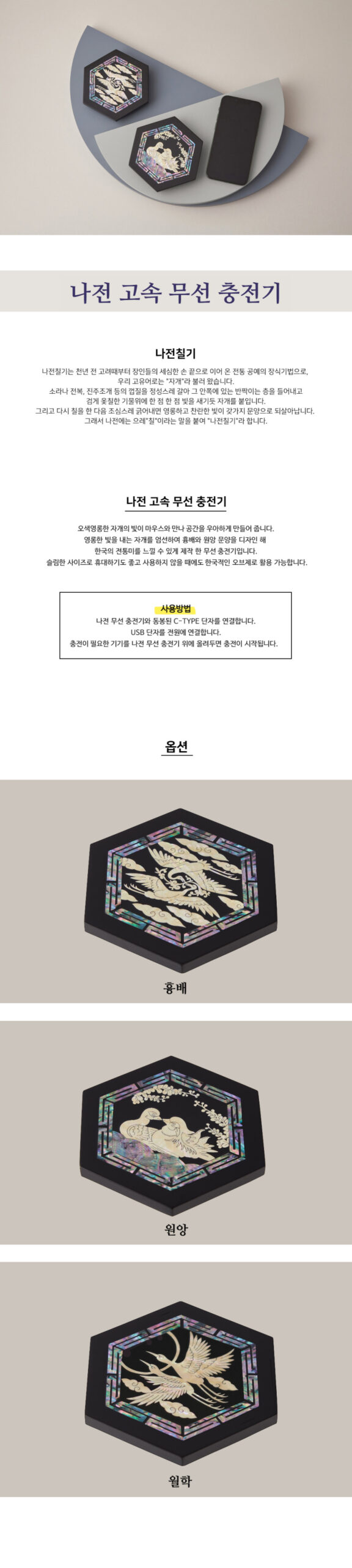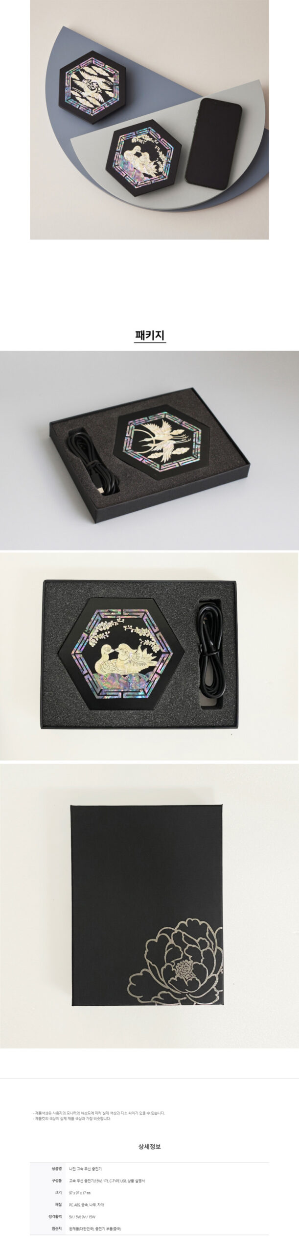 The Mother-of-pearl Lacquerware High-Speed Wireless Charger blends advanced charging technology with the intricate beauty of Najeon Chilgi, a thousand-year-old Korean craft known as mother-of-pearl inlay. This charger showcases exquisite mother-of-pearl designs featuring traditional chest badge and mandarin duck motifs, celebrating Korea’s rich cultural heritage in every detail.
