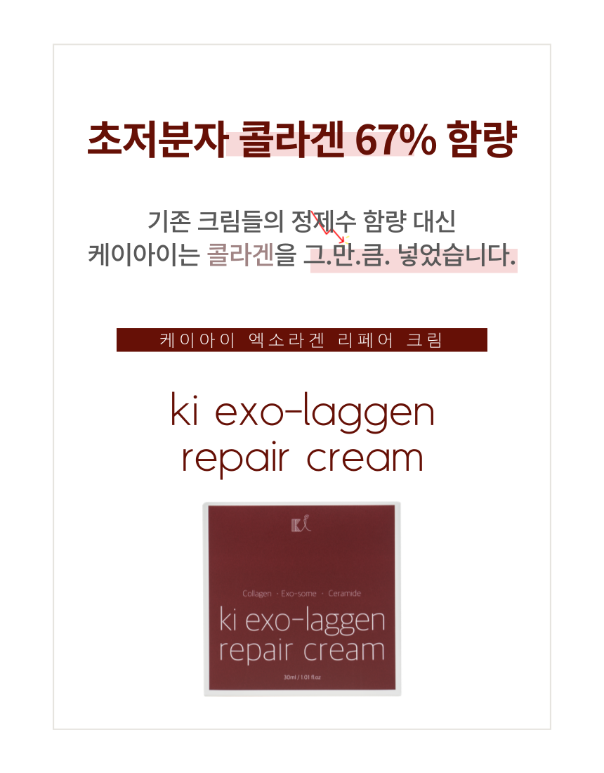 Transform your skincare routine with KI Exo-Laggen Repair Cream, a premium aesthetic-grade cream enriched with ultra-low molecular weight collagen and high-concentration exosomes for rapid absorption and visible results. Unlike conventional creams that use purified water as a base, KI replaces it with a groundbreaking 64% collagen content, ensuring unparalleled nourishment and skin affinity.