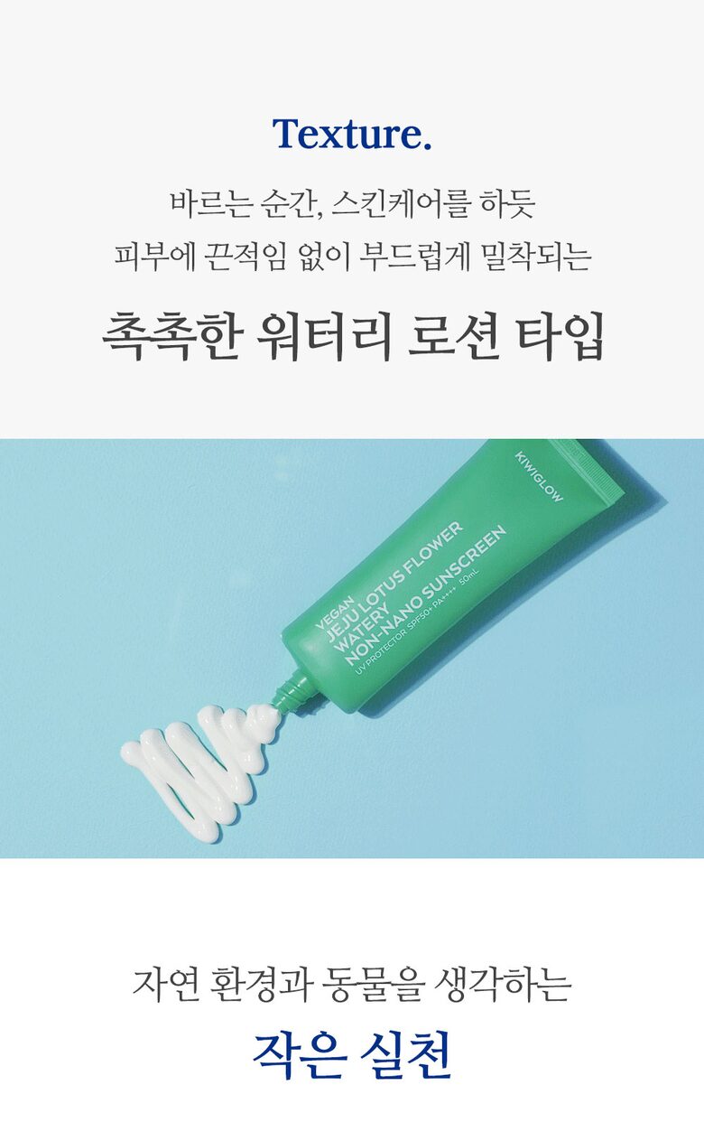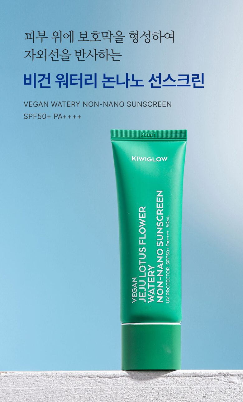 - Dense Protection: The non-nano particles in KIWIGLOW Vegan Jeju Lotus Watery Inorganic Non-nano Sun Cream are meticulously sized (0.00% under 100 mm) to provide tight UV ray blockage while being safe for the skin.