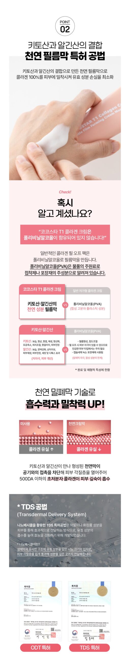 A breakthrough transdermal delivery system (TDS, Patent No. 10-1787556) and oral dissolvable technology (ODT, Patent No. 10-1577398) enhance ingredient absorption. The mask forms a thin, breathable film using a patented combination of chitosan and alginic acid: