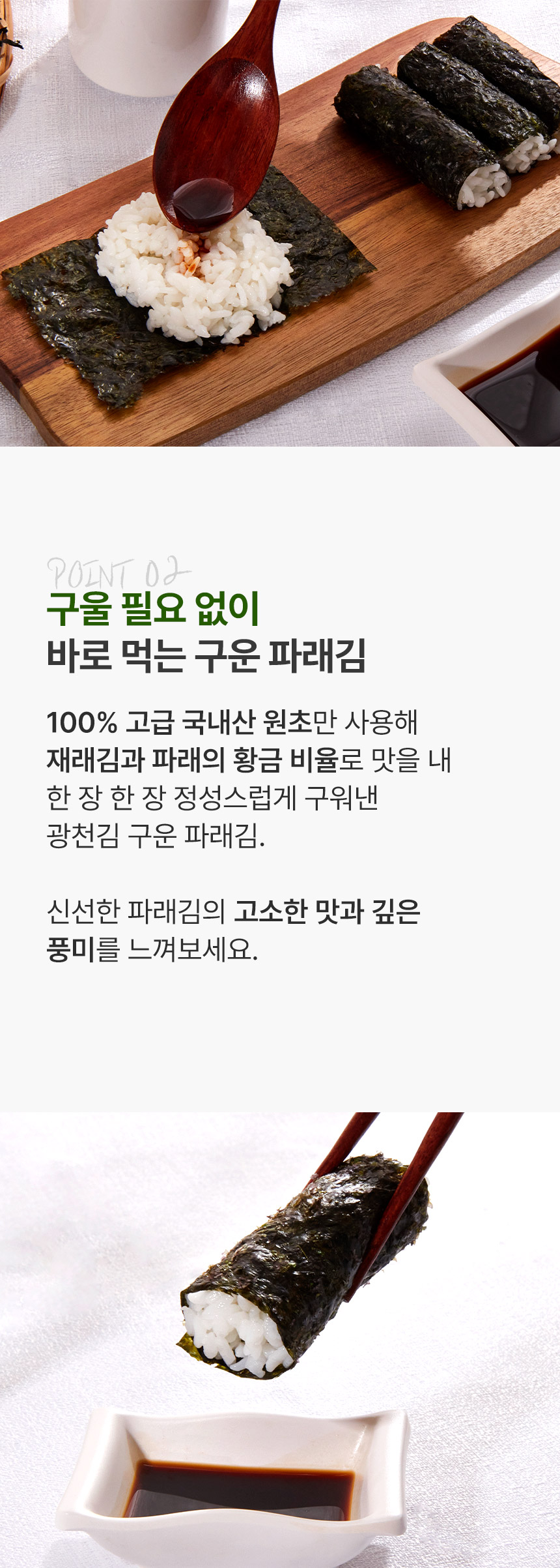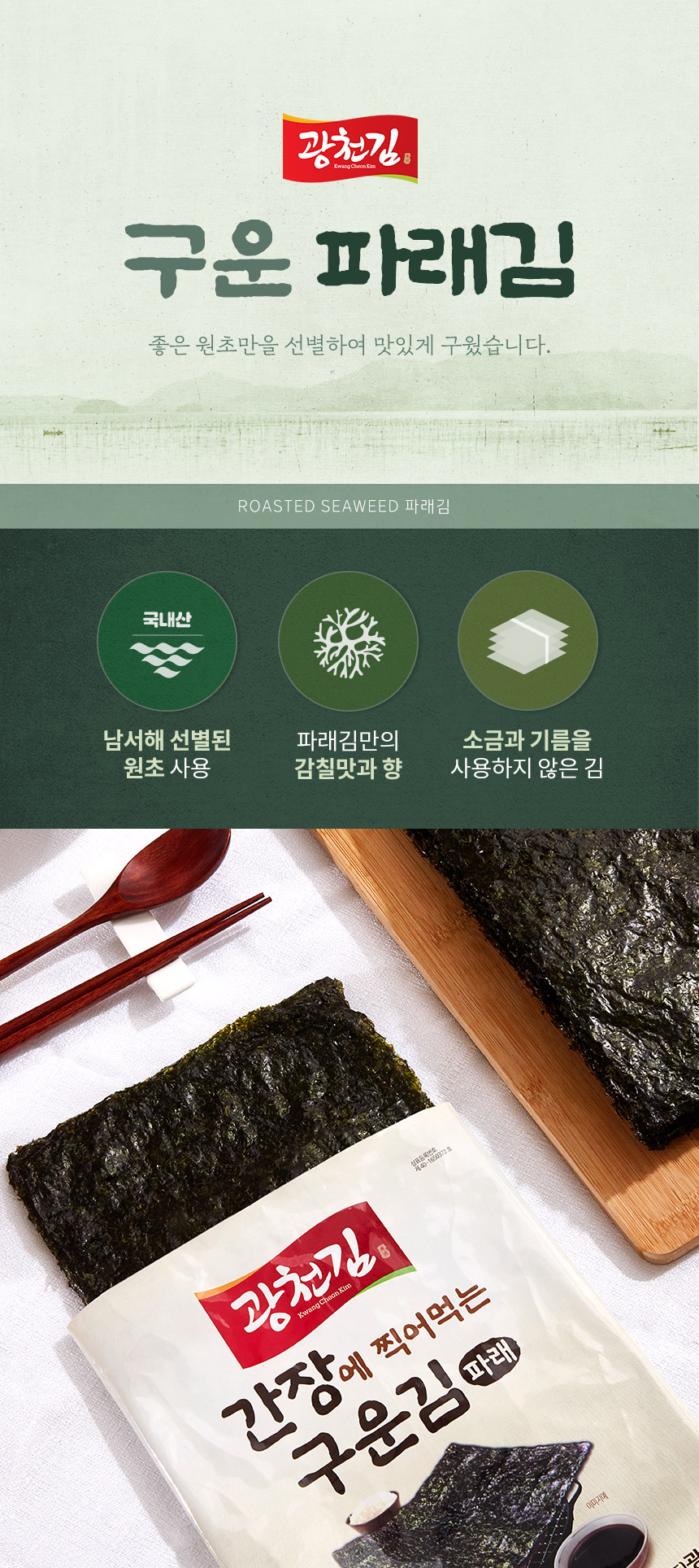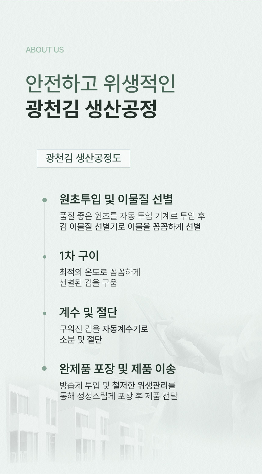 Gwangcheon Kim is committed to the highest standards of safety and hygiene in our production process. From initial sorting to remove foreign substances, through careful roasting and cutting, to the final packaging with desiccants for moisture control, every step is designed to ensure the quality and safety of our seaweed.