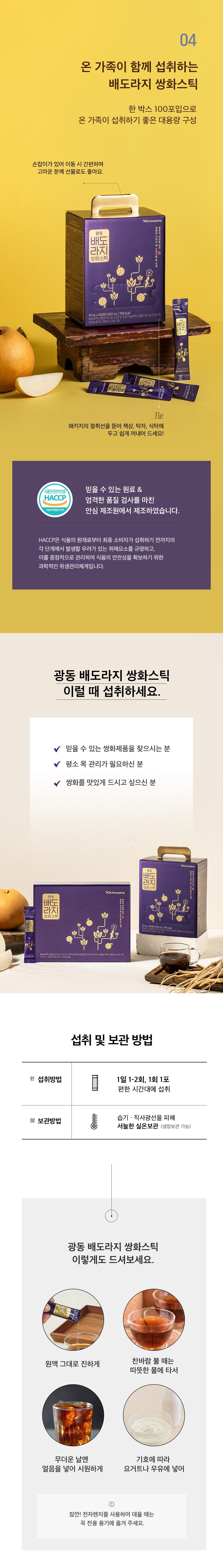 Kwangdong Pear Bellflower Ssanghwa Stick is manufactured by a safe producer that adheres to strict quality inspections and utilizes reliable raw materials. Our commitment to food safety is underscored by our HACCP certification.