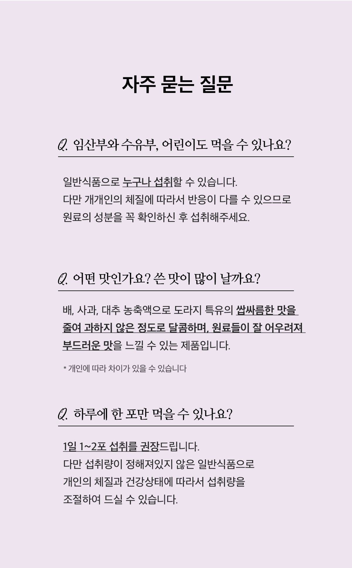 It is a product that has been carefully formulated to reduce the unique bitter taste of bellflower with the natural sweetness of pear, apple, and jujube concentrate. You will experience a soft, well-harmonized flavor of the ingredients.