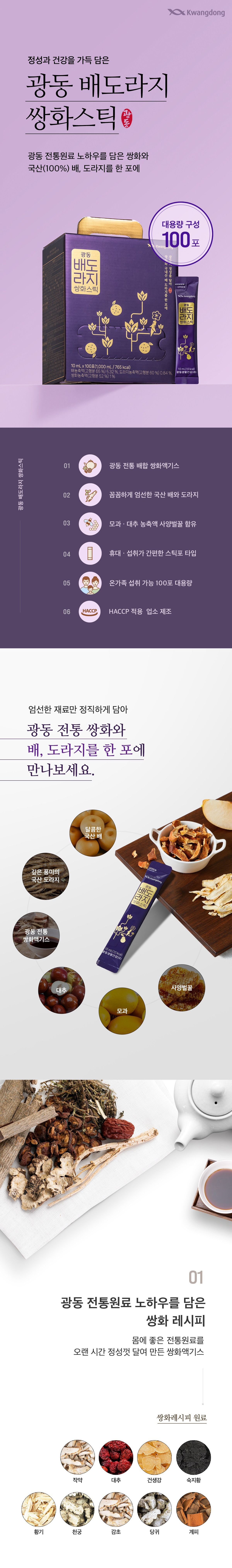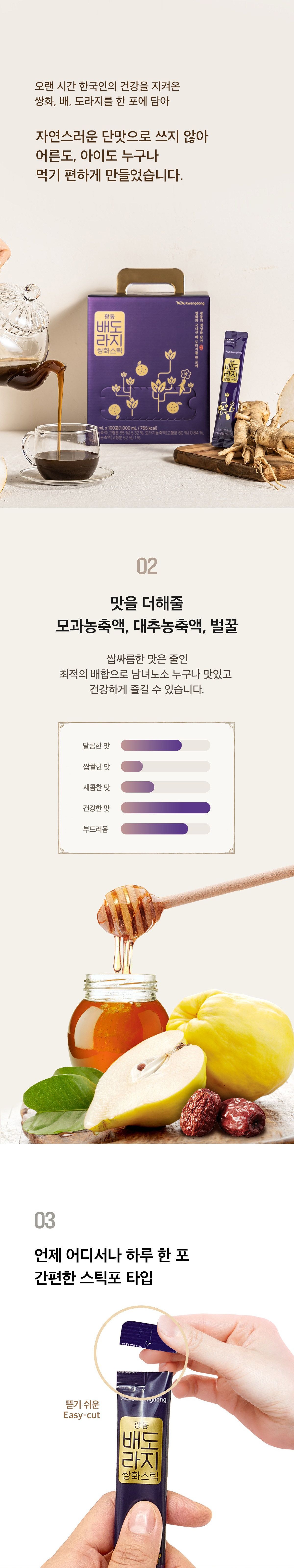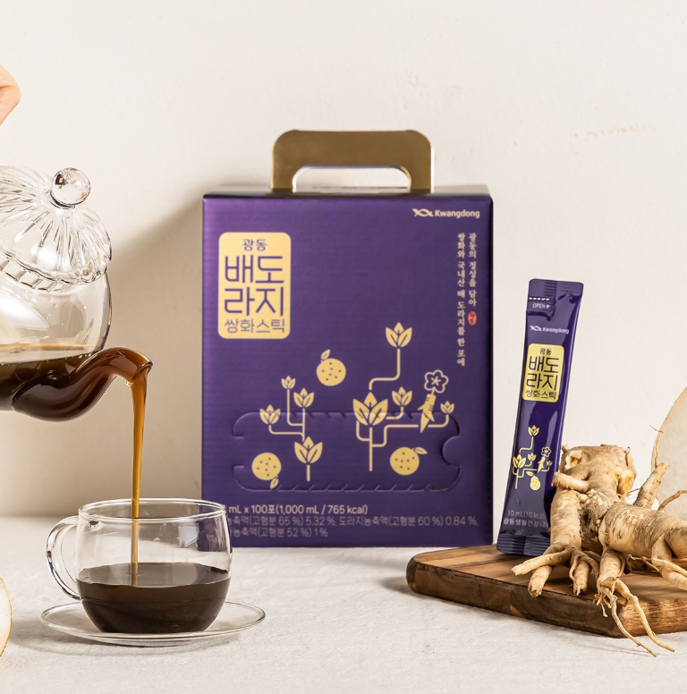Kwangdong, a name synonymous with trusted Korean health products, brings you a stick-type beverage overflowing with sincerity and health. Our Pear Bellflower Ssanghwa Stick is a testament to Kwangdong’s traditional raw material know-how, carefully packed into every 10ml pouch.