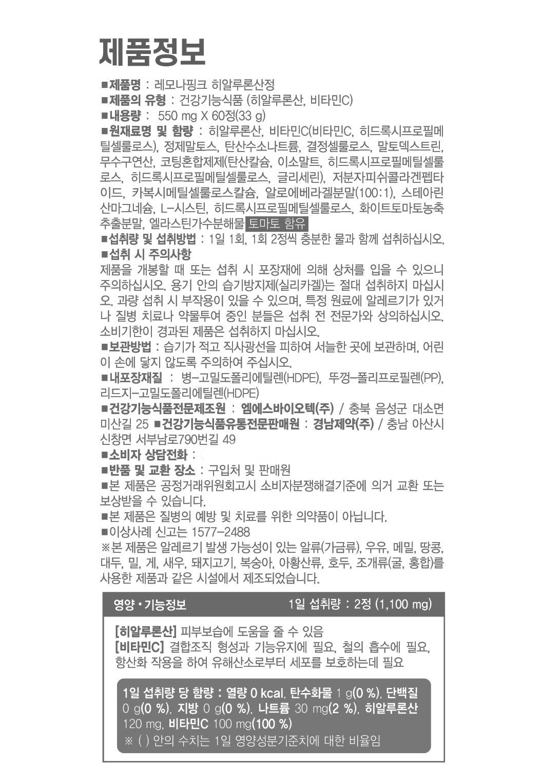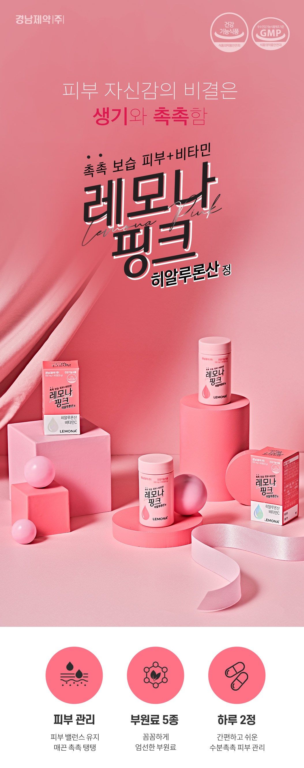 Kyungnam Pharm, with over 65 years of experience in the pharmaceutical industry, is committed to enhancing health and beauty through reliable and scientifically backed products. LEMONA Pink Hyaluronic Acid Tablets are produced in a GMP (Good Manufacturing Practice) certified facility, ensuring the highest standards of quality and hygiene.