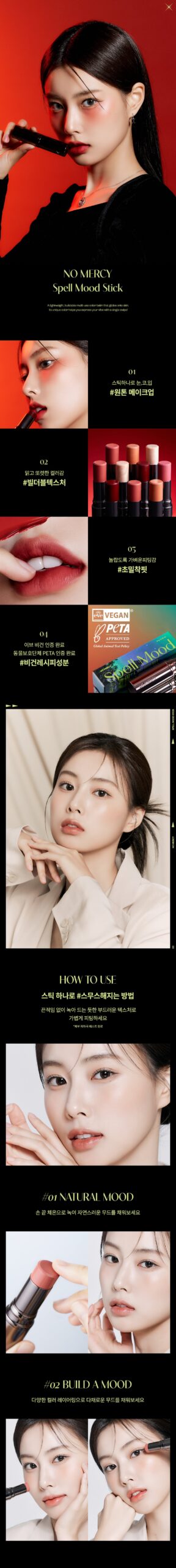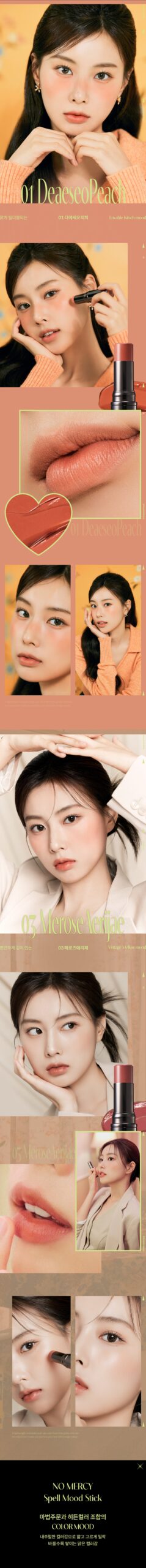 At first glance, I thought, another multi-use product? However, the No Mercy Spell Mood Stick truly broke my preconceived notions. Imagine unearthing a luscious peach sunset every time you swipe on DEAESEO PEACH—its ethereal blend didn’t just adapt to my features but danced along with them. Adapting seamlessly from cheeks to lips, each hue exudes its charm without overwhelming like so many cosmetics tend to do. Mixing it around offered unexpected surprises; applying ROOPINK TELCHAM for afternoon delight evolved into MEROSE AERIJAE’s shimmering playfulness by evening! The thrill was undeniable—the glowing energy and radiant vibes amplified throughout the day! An investment in creativity worth exploring!