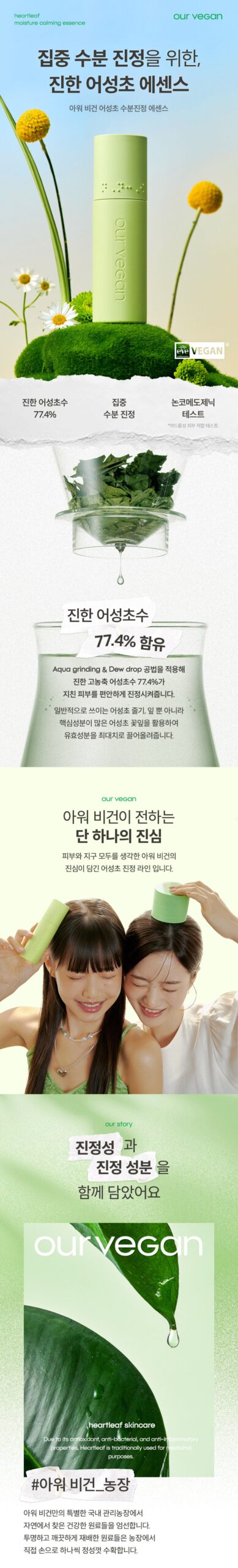 Experience the ultimate hydration and soothing care with the Our Vegan Heartleaf Moisture Calming Essence, featuring a concentrated formula with 77.4% heartleaf essence.