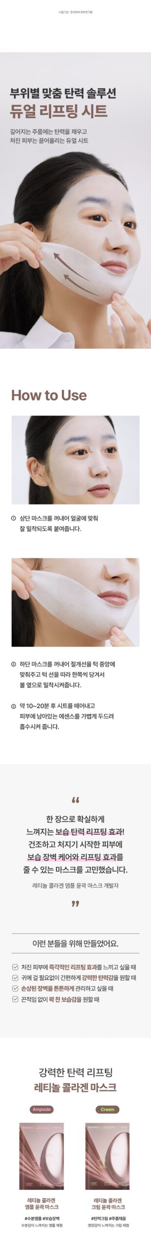 Our dual lifting sheet is specifically designed to add elasticity to deepening wrinkles and lift sagging skin, offering a customized solution for different facial areas.