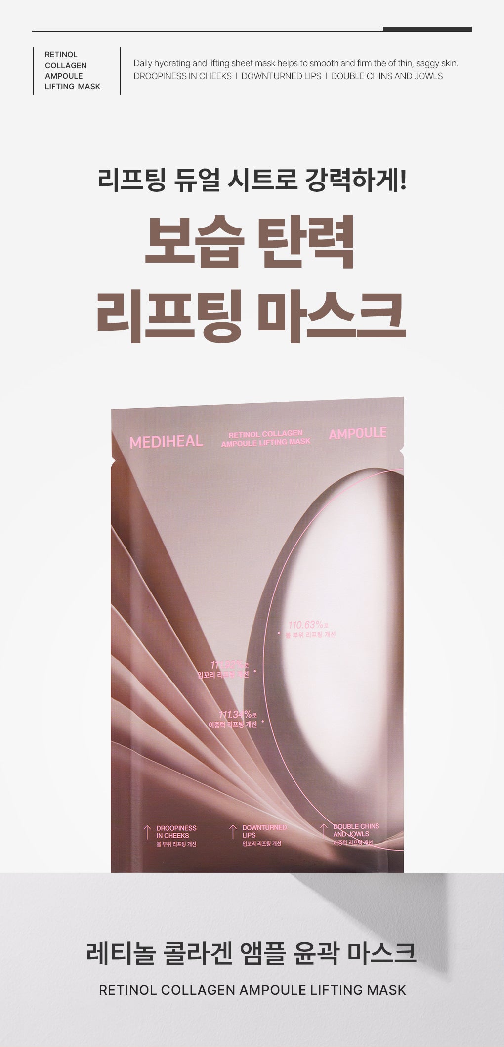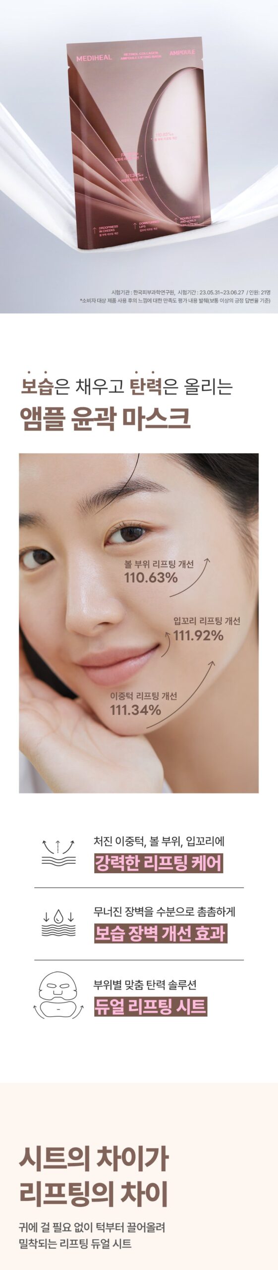 Our dual lifting sheet is specifically designed to add elasticity to deepening wrinkles and lift sagging skin, offering a customized solution for different facial areas.