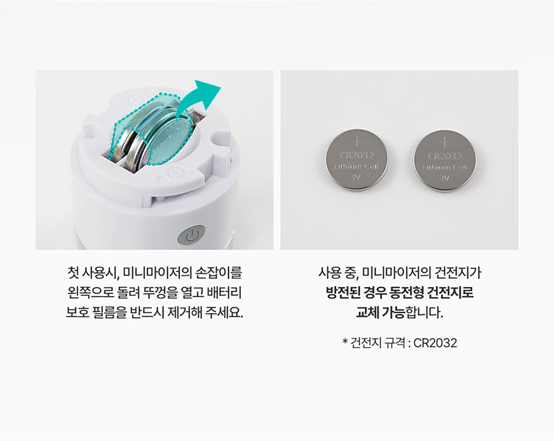 - Before initial use, open the minimizer handle, remove the battery protection film, and reassemble.
