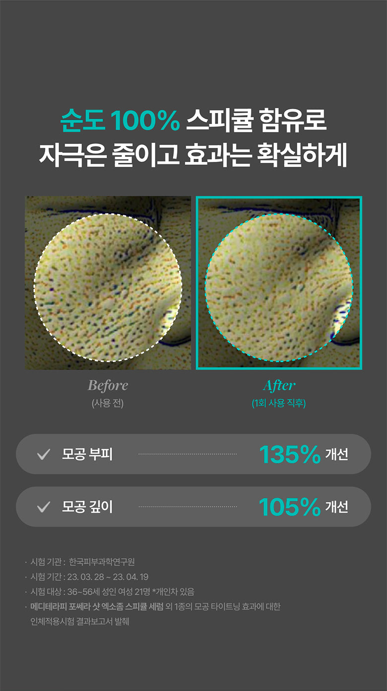 Harness the power of 100% pure Centella Asiatica-coated spicules. This unique formulation minimizes skin irritation while delivering potent tightening effects deep into the skin. Clinical results have shown a reduction in pore surface area by approximately one-third after a single use.