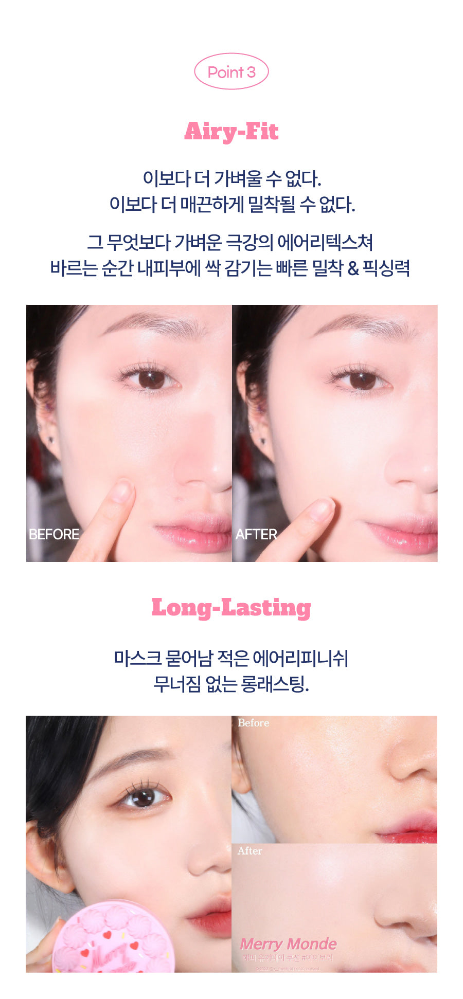 Say goodbye to visible pores and uneven texture! The cushion offers thin yet powerful coverage, improving adhesion with every tap. The high-density antibacterial puff allows for smooth, even application without clogging pores or creating a heavy, cakey look.