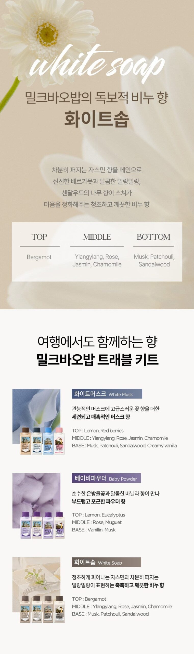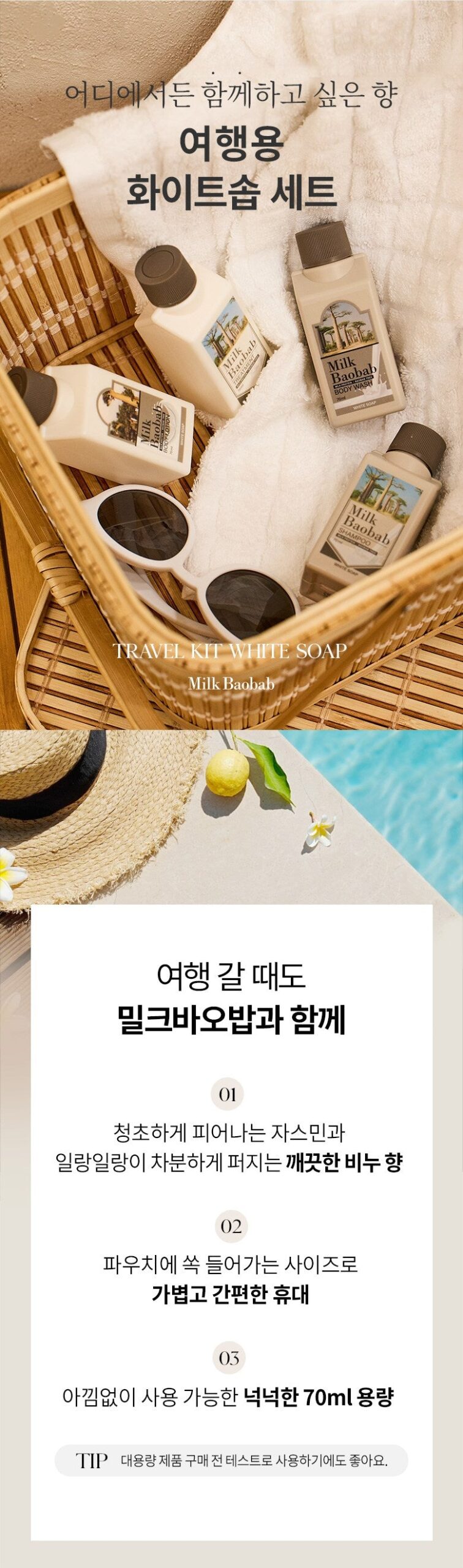 トラベルキットを試してみて、見事に魅了されました。特にこのホワイトソープの香りは、一瞬で新しい世界へ導いてくれるかのようなフレッシュ感があります。このシャンプーを使用した後、髪が驚くほど柔らかになり、櫛も通る状態。バオバブエキスとミルクプロテインのおかげでしょうね。そしてボディローションでは全身がうるおい満ち、この潤滑さは旅行先でもありがたい!間違いなくお気に入りとして追加します。