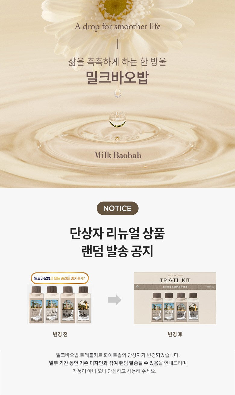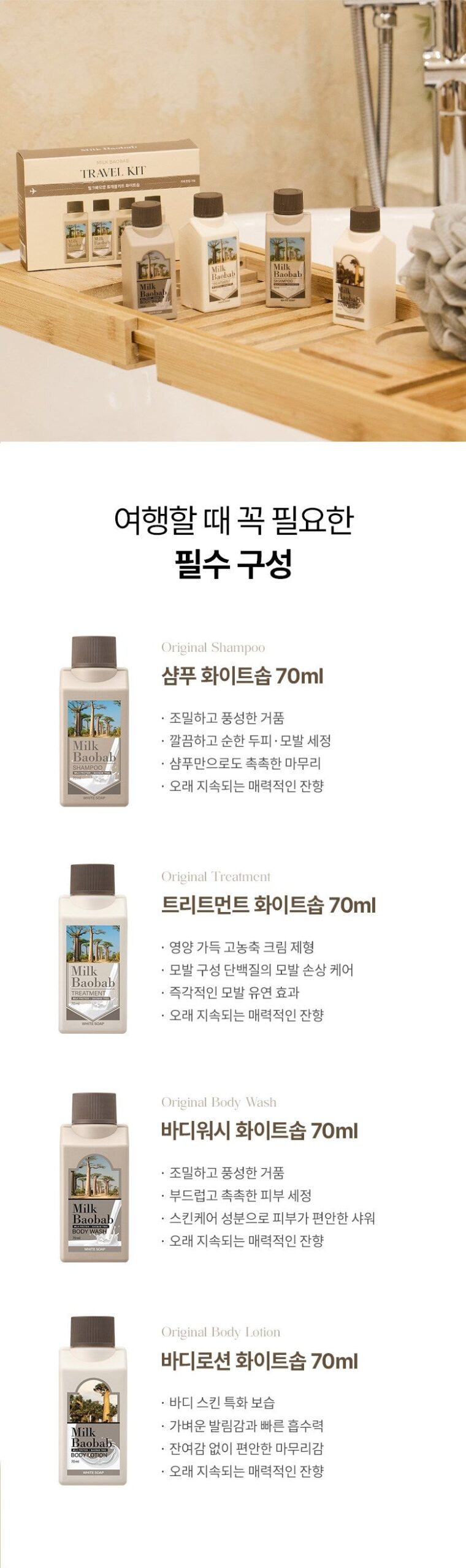 トラベルキットを試してみて、見事に魅了されました。特にこのホワイトソープの香りは、一瞬で新しい世界へ導いてくれるかのようなフレッシュ感があります。このシャンプーを使用した後、髪が驚くほど柔らかになり、櫛も通る状態。バオバブエキスとミルクプロテインのおかげでしょうね。そしてボディローションでは全身がうるおい満ち、この潤滑さは旅行先でもありがたい!間違いなくお気に入りとして追加します。