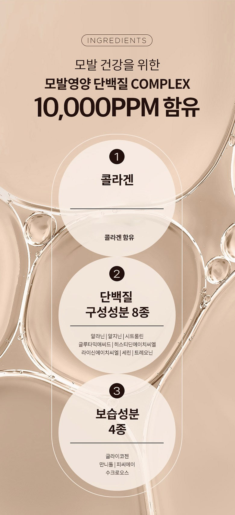 - Hair Nutrition Protein Complex: With a high concentration of 10,000ppm, it deeply nourishes your hair.