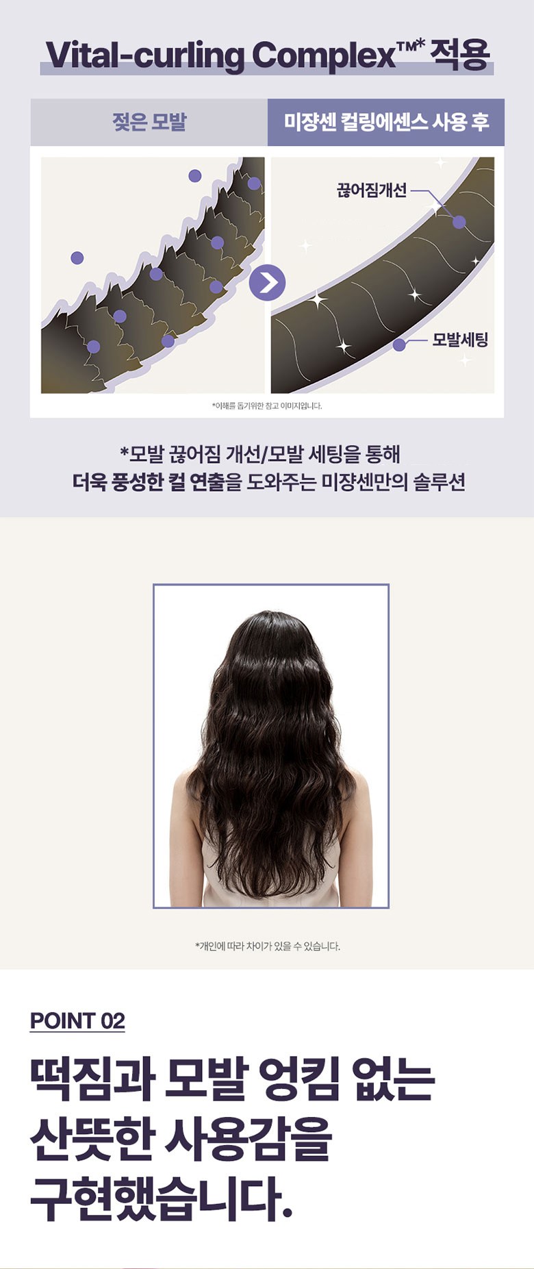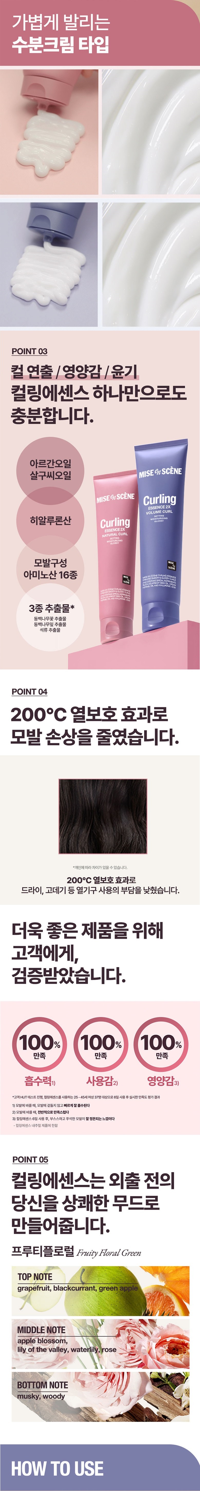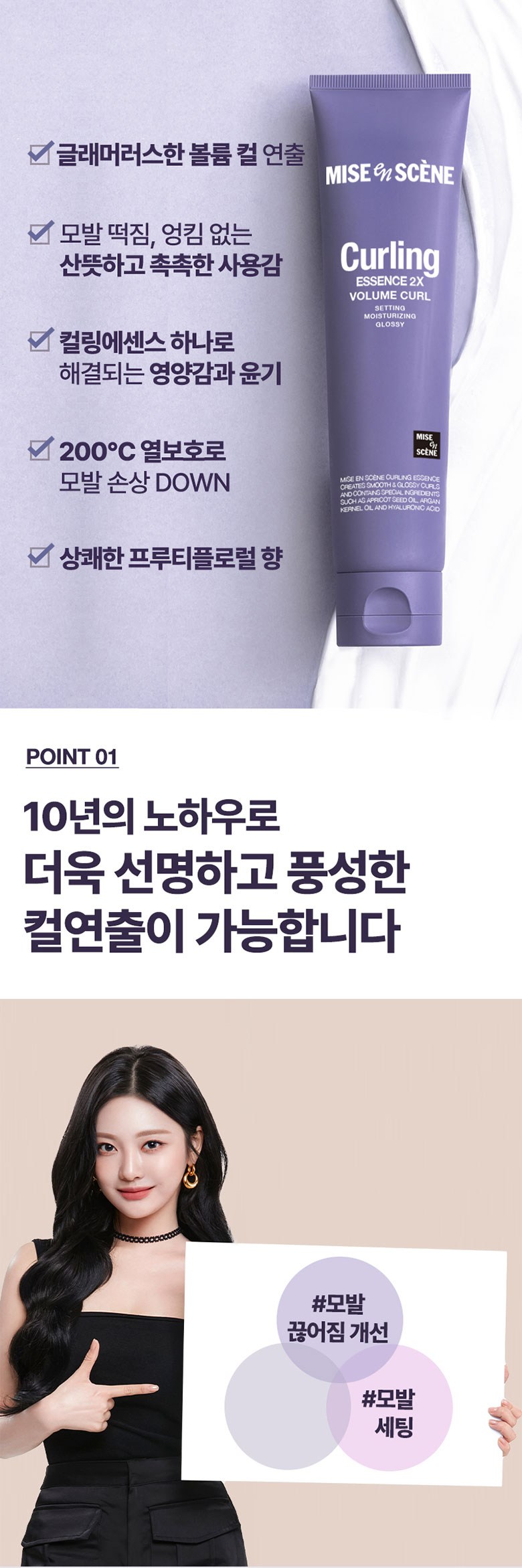Point 01: Developed with a decade of accumulated know-how, Mise en Scène Curling Essence 2X allows for more vivid, richer, and perfectly set curl styling. Our advanced formula goes beyond simple styling, offering holistic hair improvement: