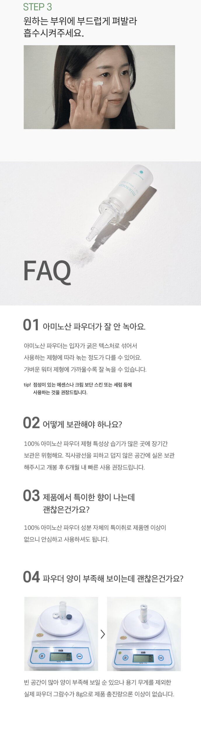 - For optimal dissolution, combine with a hyaluronic acid serum. Should any amino acid powder remain undissolved, gently massage it onto your skin until fully absorbed.