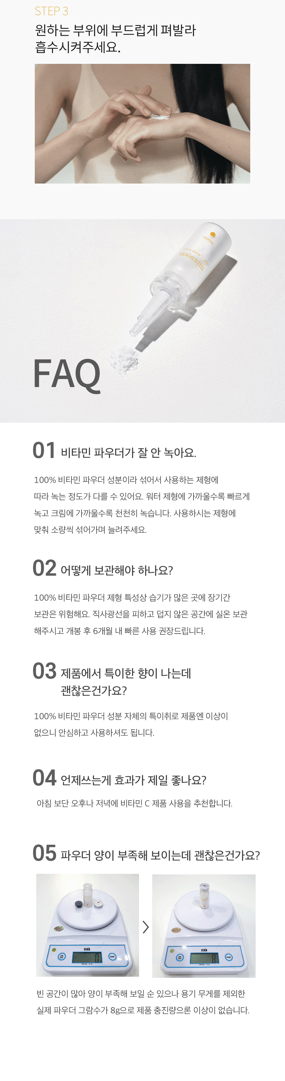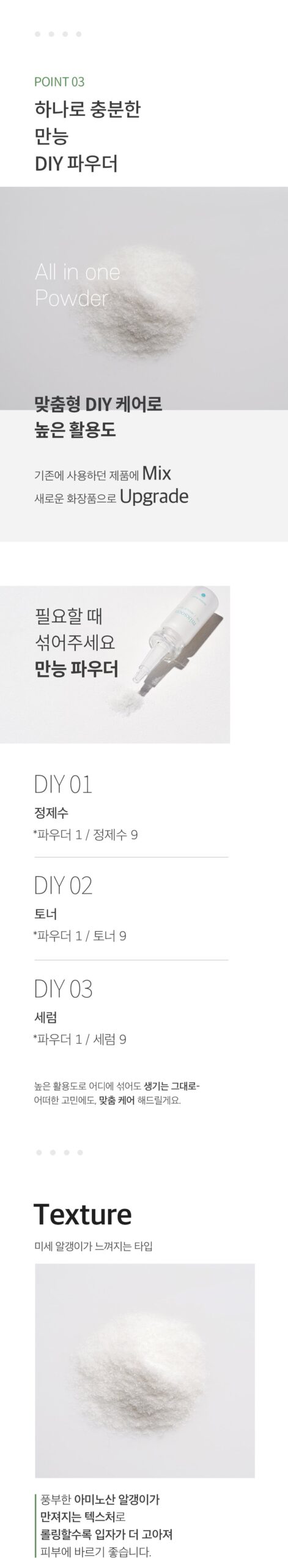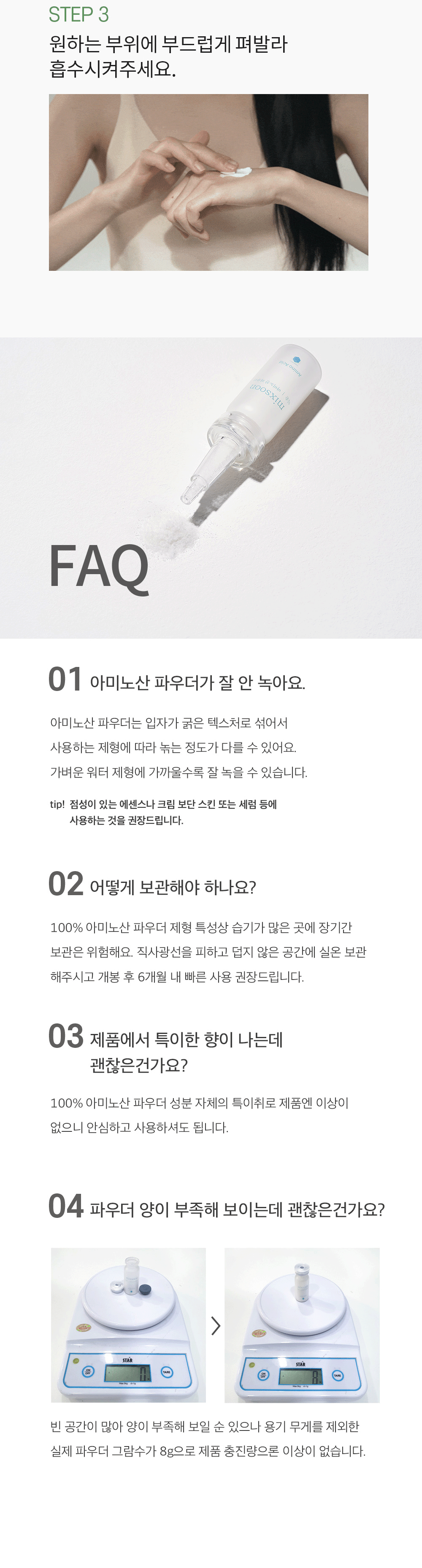 - For optimal dissolution, combine with a hyaluronic acid serum. Should any amino acid powder remain undissolved, gently massage it onto your skin until fully absorbed.