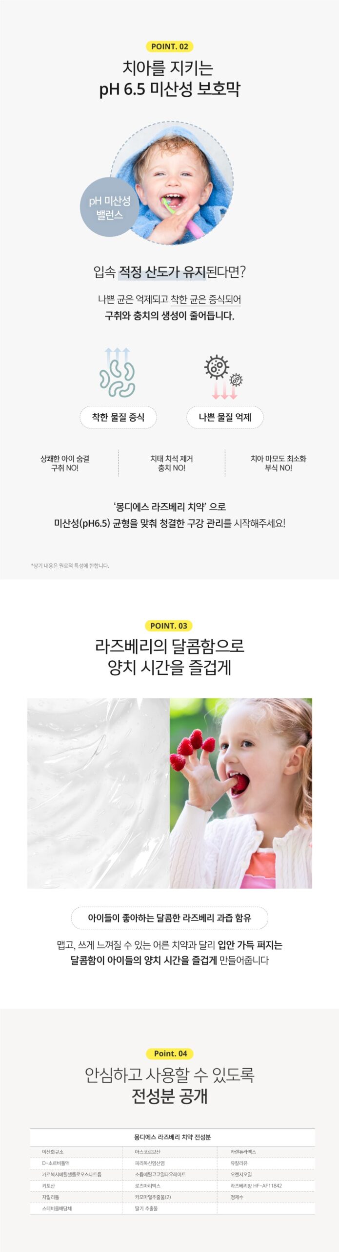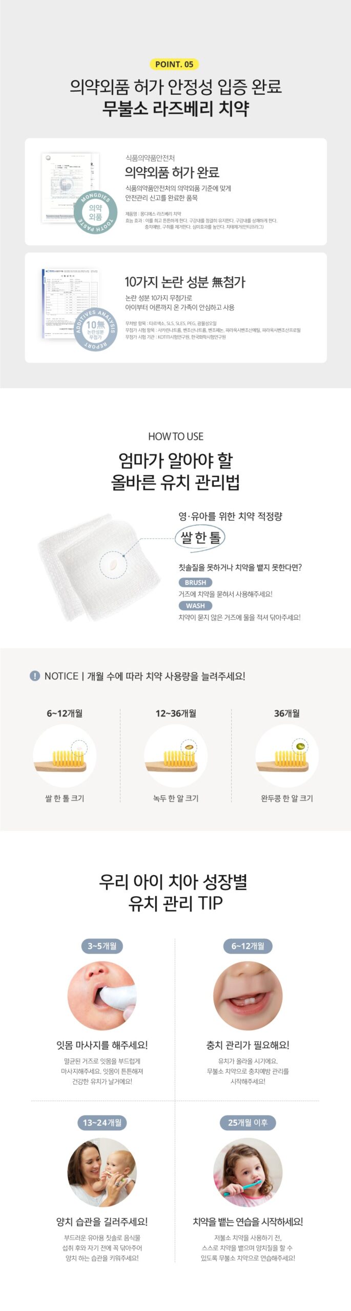 Our raspberry toothpaste is an over-the-counter product proven safe without the addition of fluoride and free from 10 controversial ingredients. It is free from tar color, SLS, SLES, PEG, mineral oil, and does not contain Sodium Saccharin, Sodium Benzoate, Benzophenone, Methylparaben, or Propylparaben. This certification is backed by KOTITI Testing & Research Institute and the Korean Chemical Testing & Research Institute, ensuring it is safe for use by the entire family.